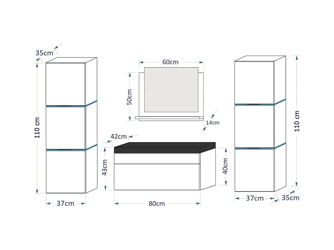 Conjunto de muebles de baño negro colección BIRD. 2 columnas, mueble bajo lavabo, lavabo de 80 cm, espejo, sifón y luces LED.