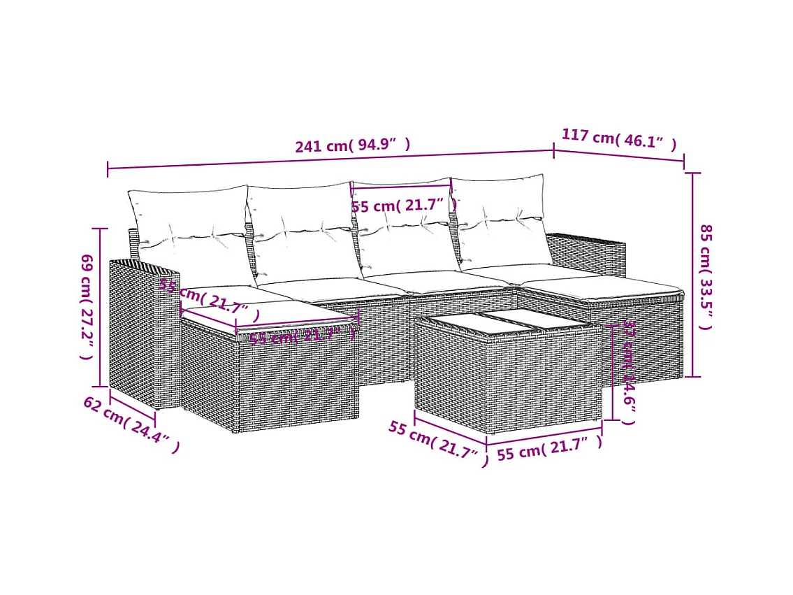 Conjunto de muebles de jardín con cojines 6 piezas resina tejida marrón