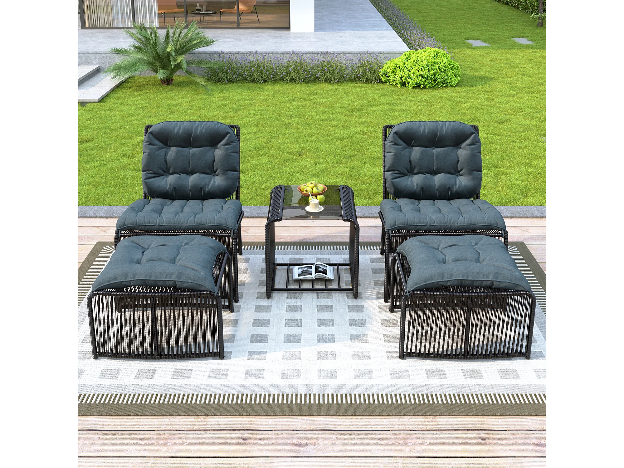 Conjunto de muebles de jardín de 5 piezas - 1 mesa + 2 sillas + 2 taburetes - de hierro y ratán sintético - con cojines - gris + negro