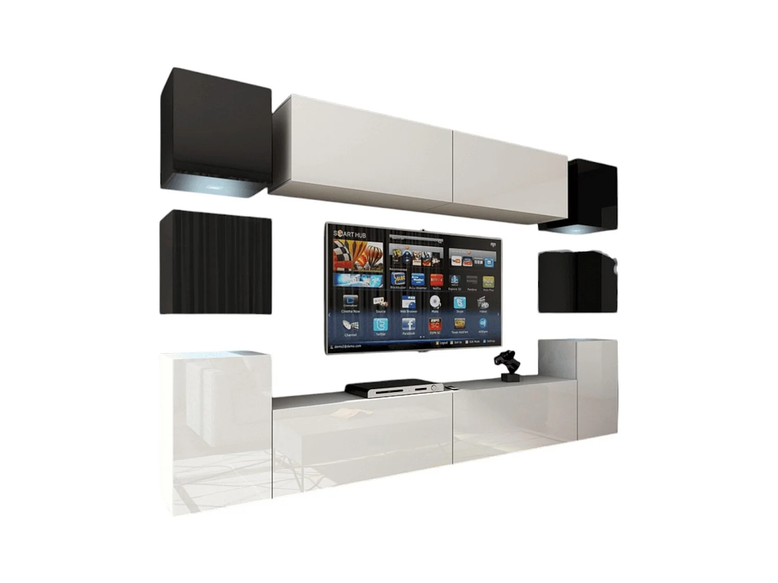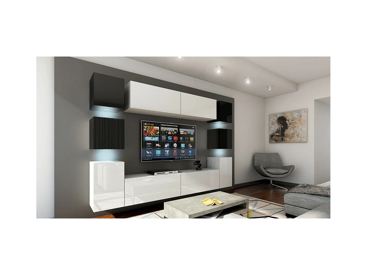 Conjunto de muebles de salón blanco y negro colgantes colección CEPTO XIV 256 cm, 10 muebles, LEDs, cubo negro