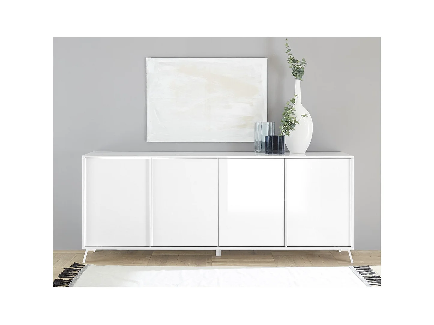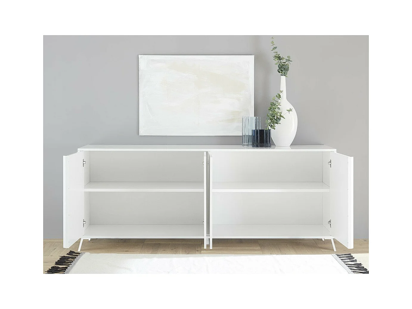 Aparador moderno 150 cm – de pie, 3 cajones y 2 puertas, cuerpo blanco mate, frentes blanco brillo, inserto roble wotan mate