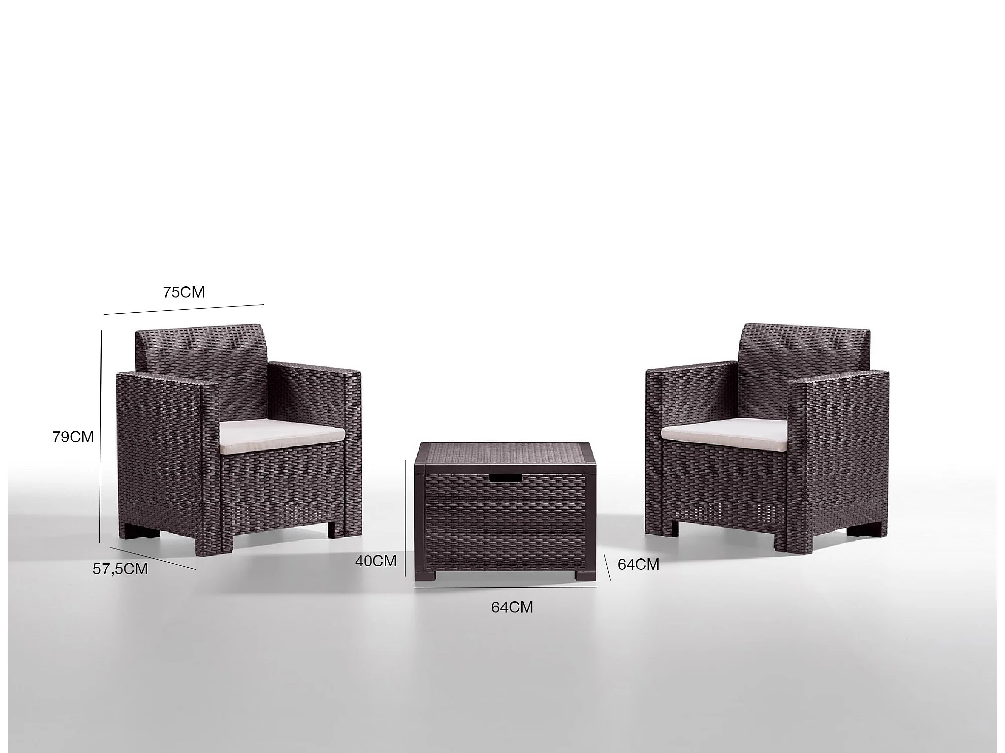 Salón de Jardín Dakain, Conjunto de jardín con 2 sillones y 1 mesa container, Zona de estar efecto ratán, 100% Made in Italy, Marrón