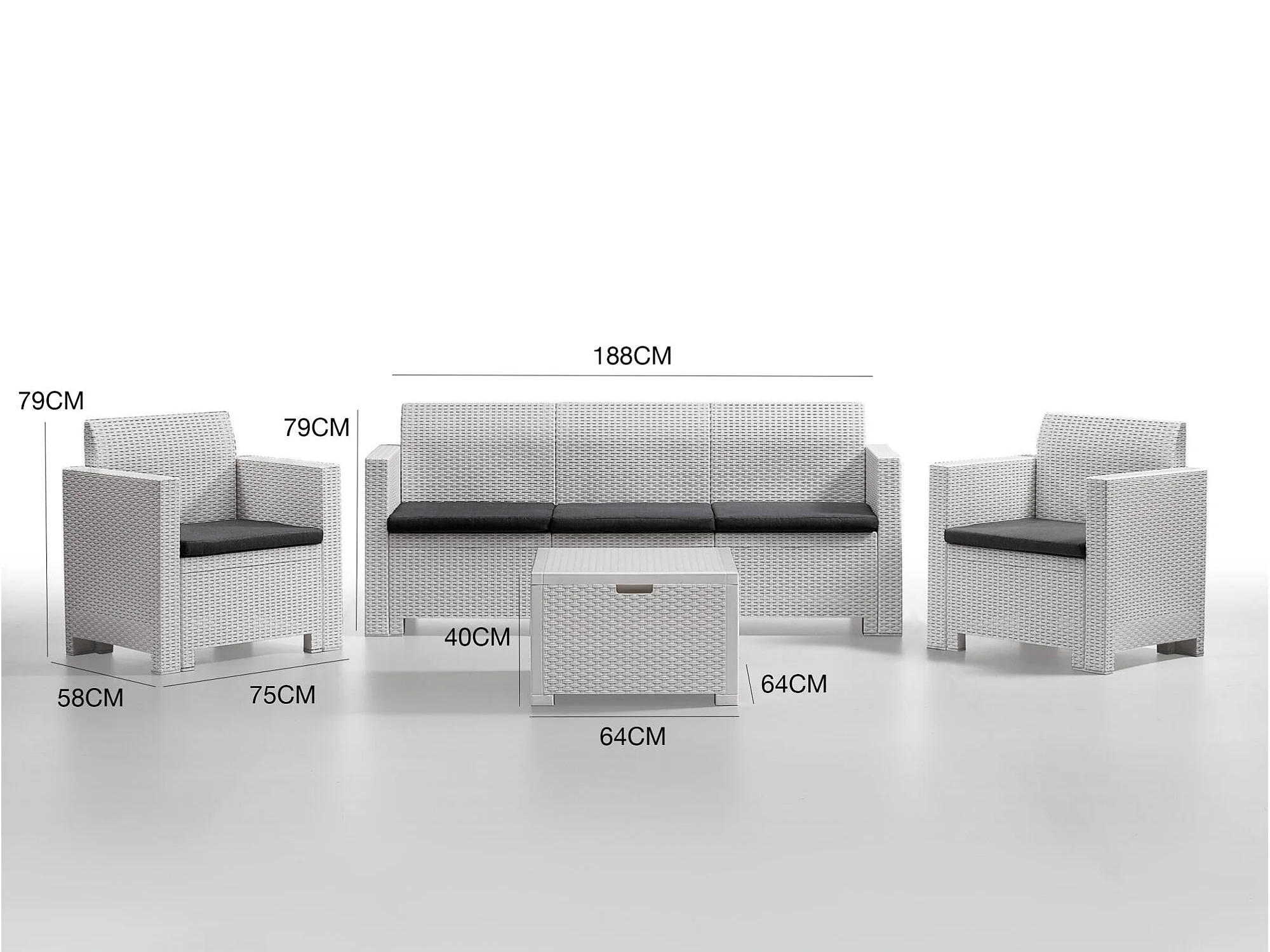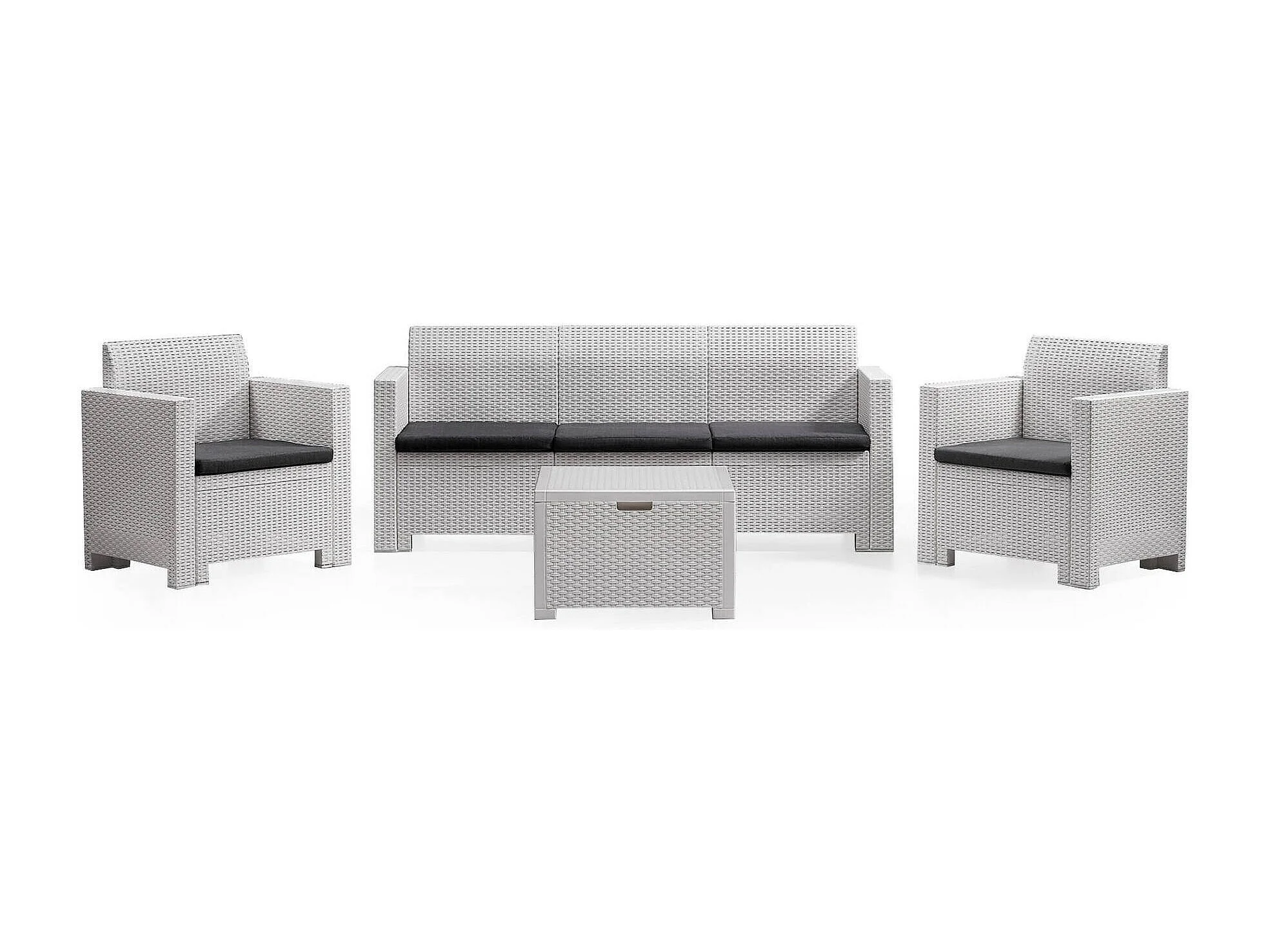 Conjunto de salón exterior Dmuh, Conjunto de jardín con cojines, Zona de estar interior efecto ratán, 100% Made in Italy, Blanco