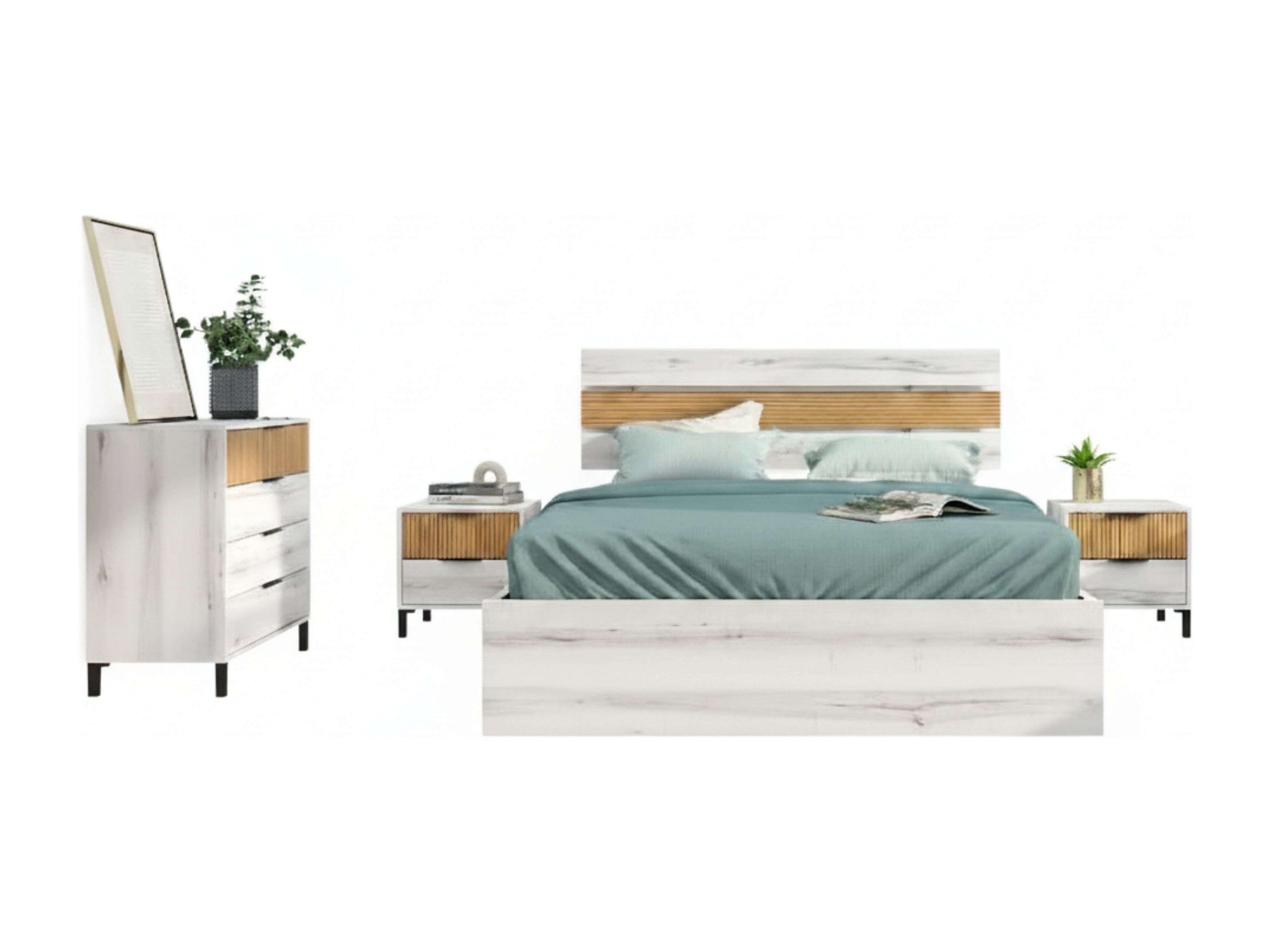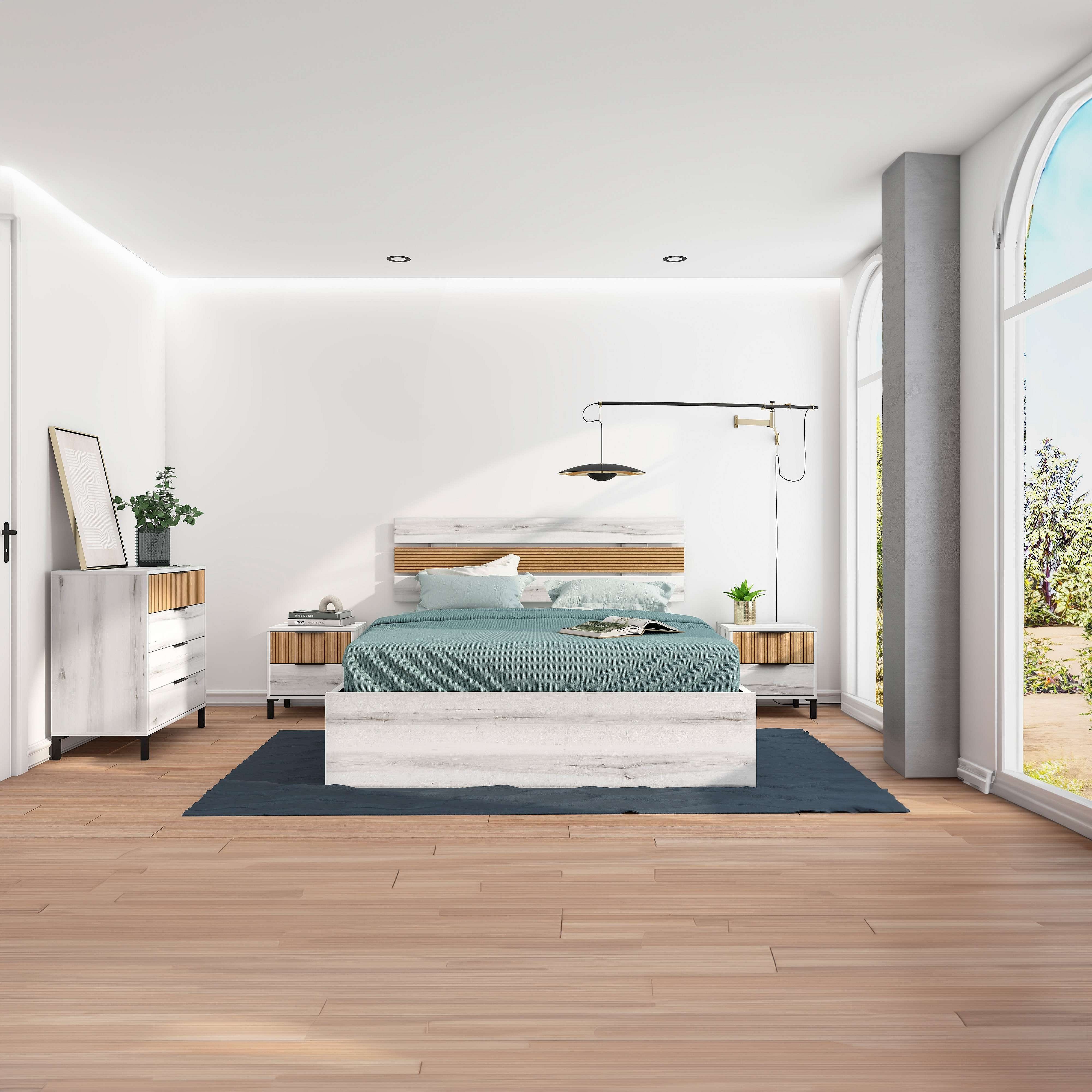 Conjunto Dormitorio Nórdico Blanco y Roble (Cama, Cabecero, Mesas, Cómoda)