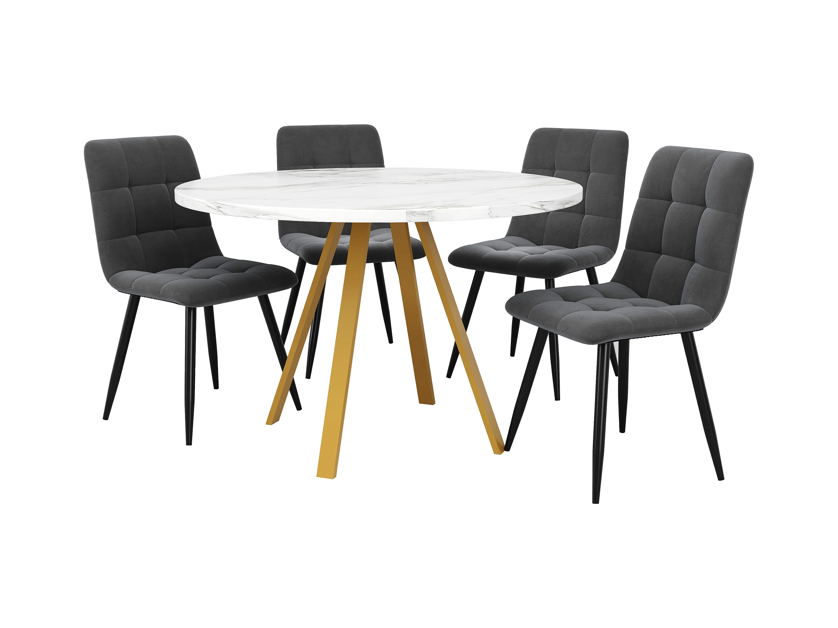 Conjunto mesa redonda 80 cm 4 sillas terciopelo gris patas metal mesa mármol blanco