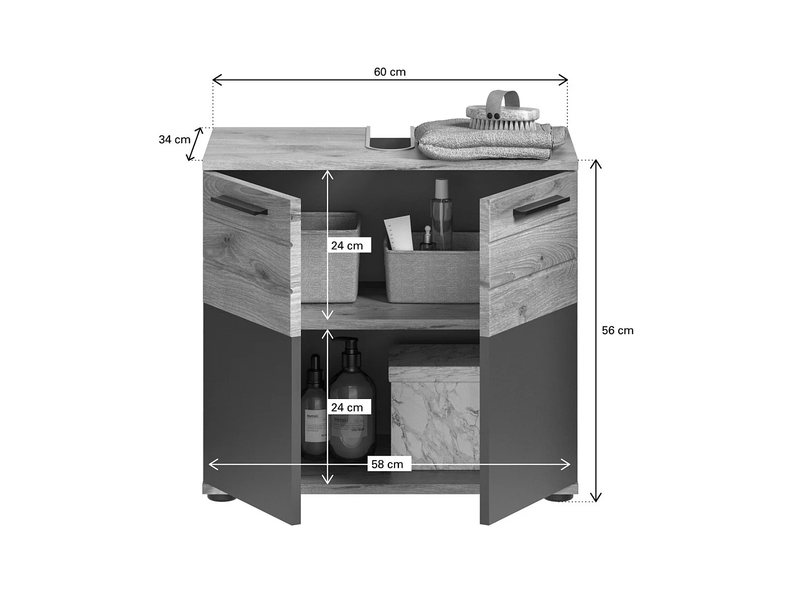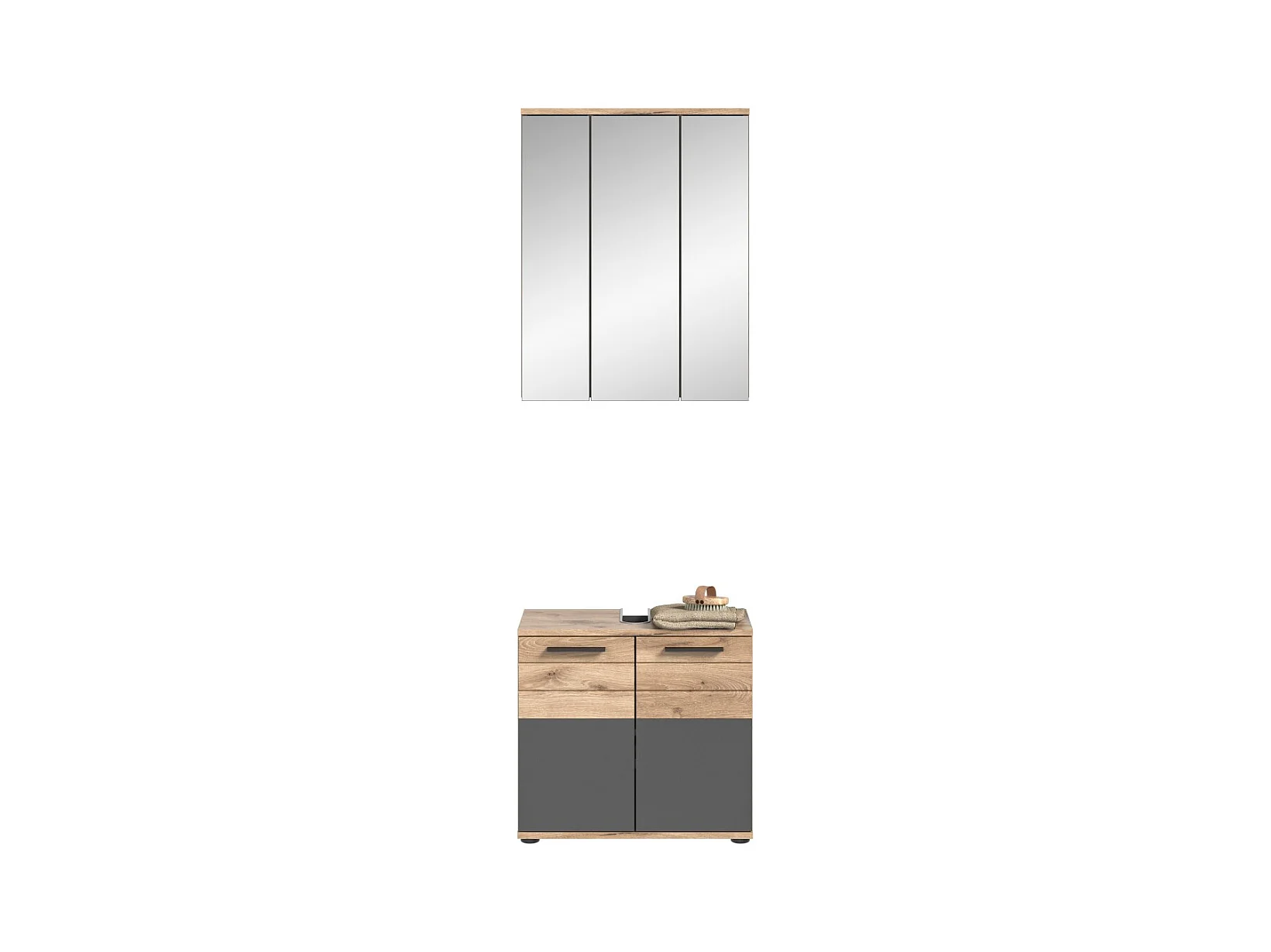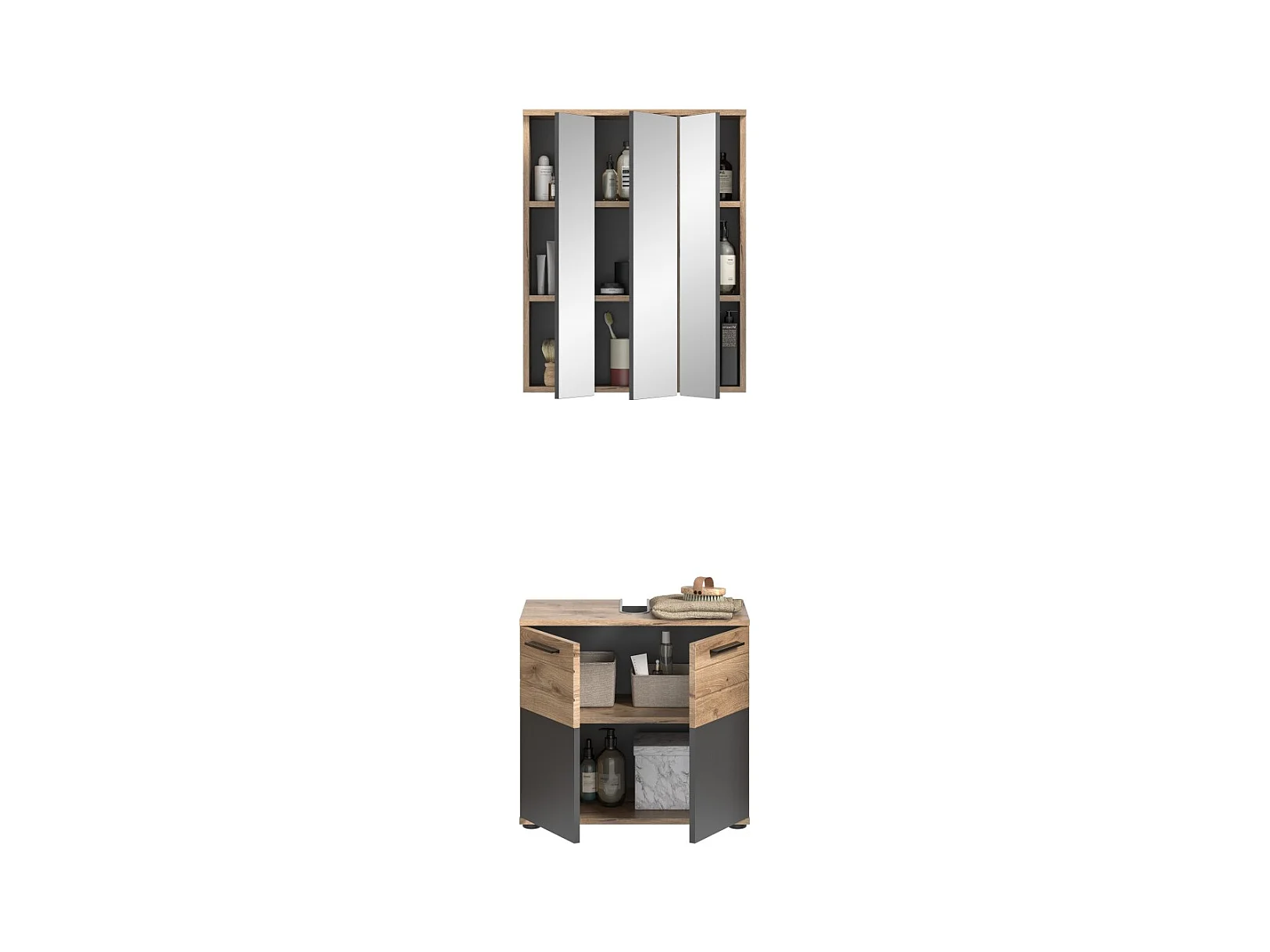 Conjunto para baño: mueble bajo lavabo + armario de almacenamiento con espejos – Gris antracita y roble claro – SELMA