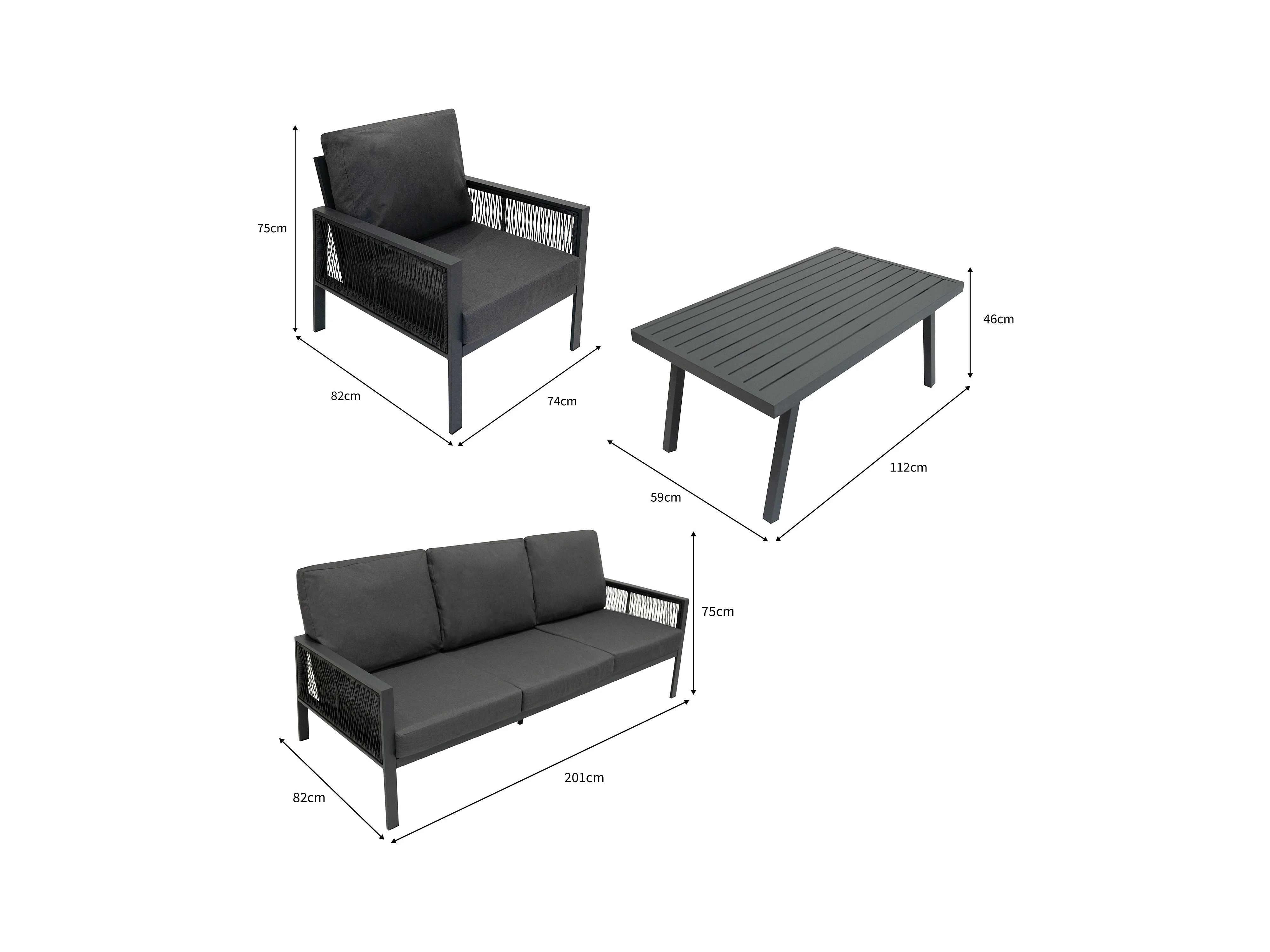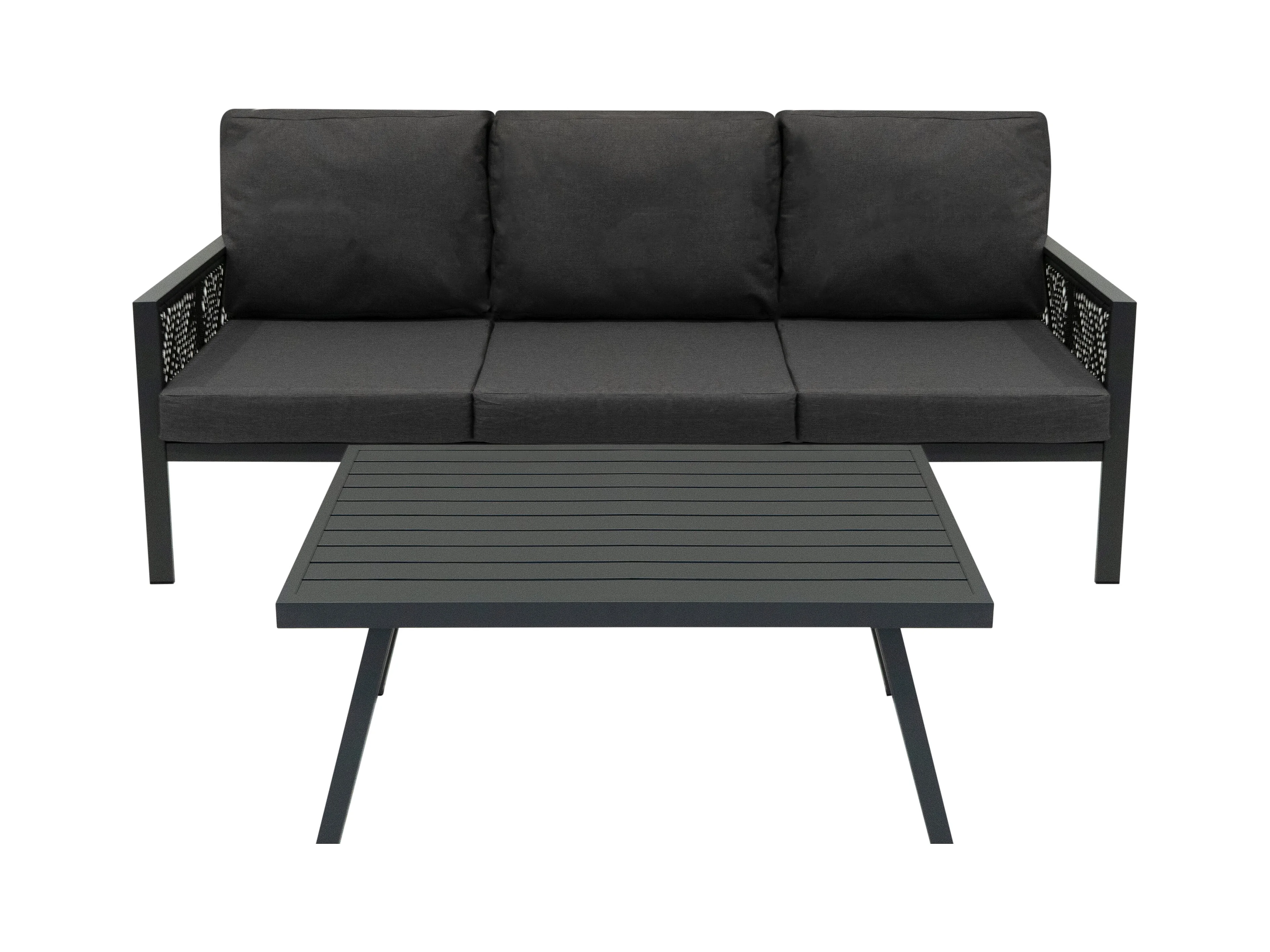 Ikigai - Conjunto de Jardín con Sofá de 3 Plazas, 2 Sillones y Mesa de Centro con Cojines en Aluminio y Madera Contrachapada
