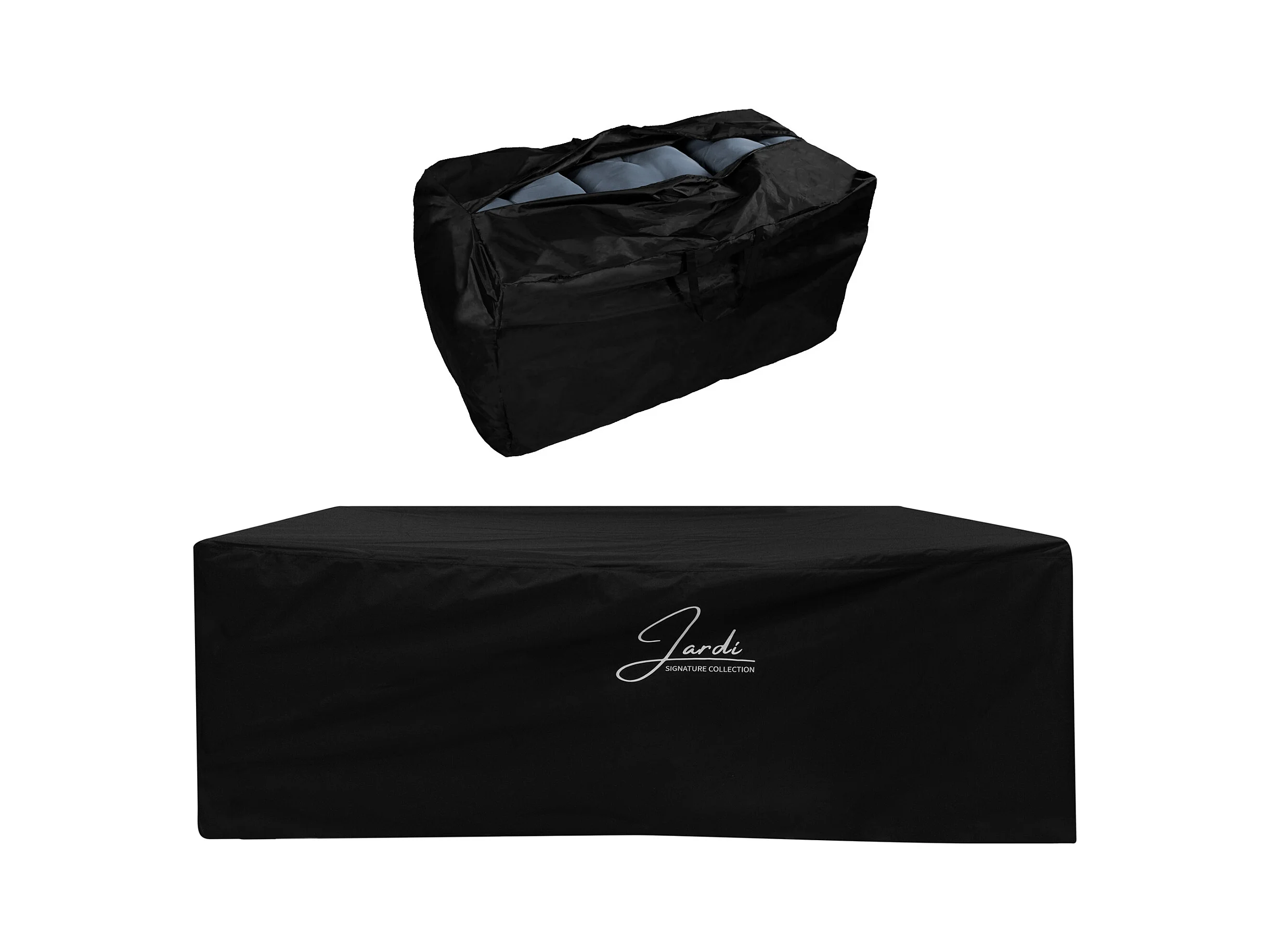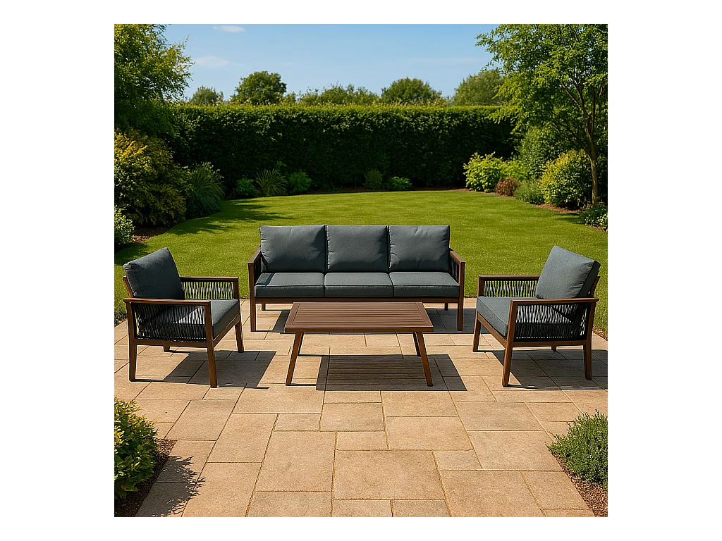 Conjunto para Exteriores de aluminio 5 plazas (4piezas) efecto madera + Caja en ratán Negro 582L