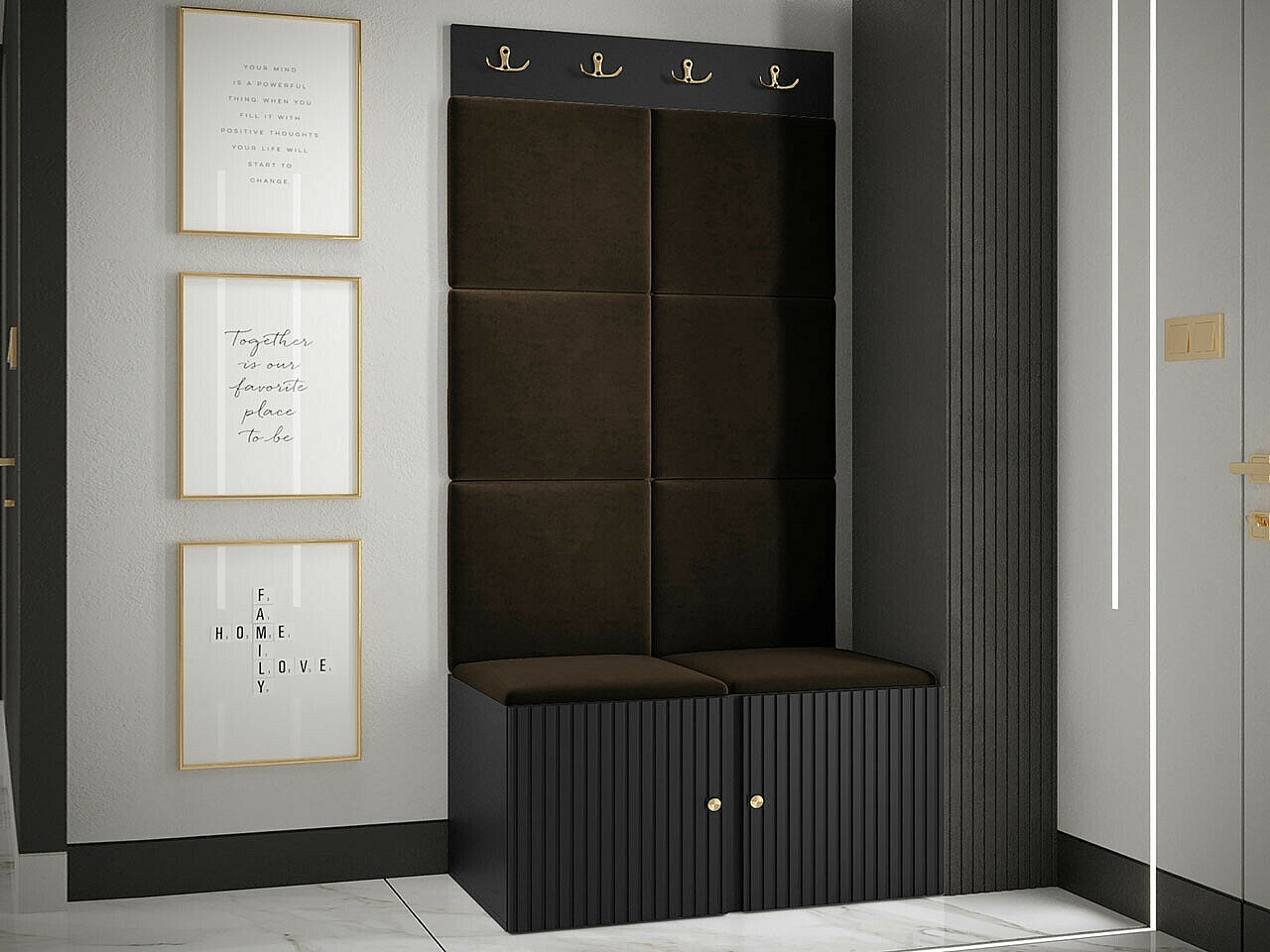 Conjunto pasillo Hartford 381, 186x82x46cm, Marrón|Negro, MDF|Aglomerado laminado|Tapiz