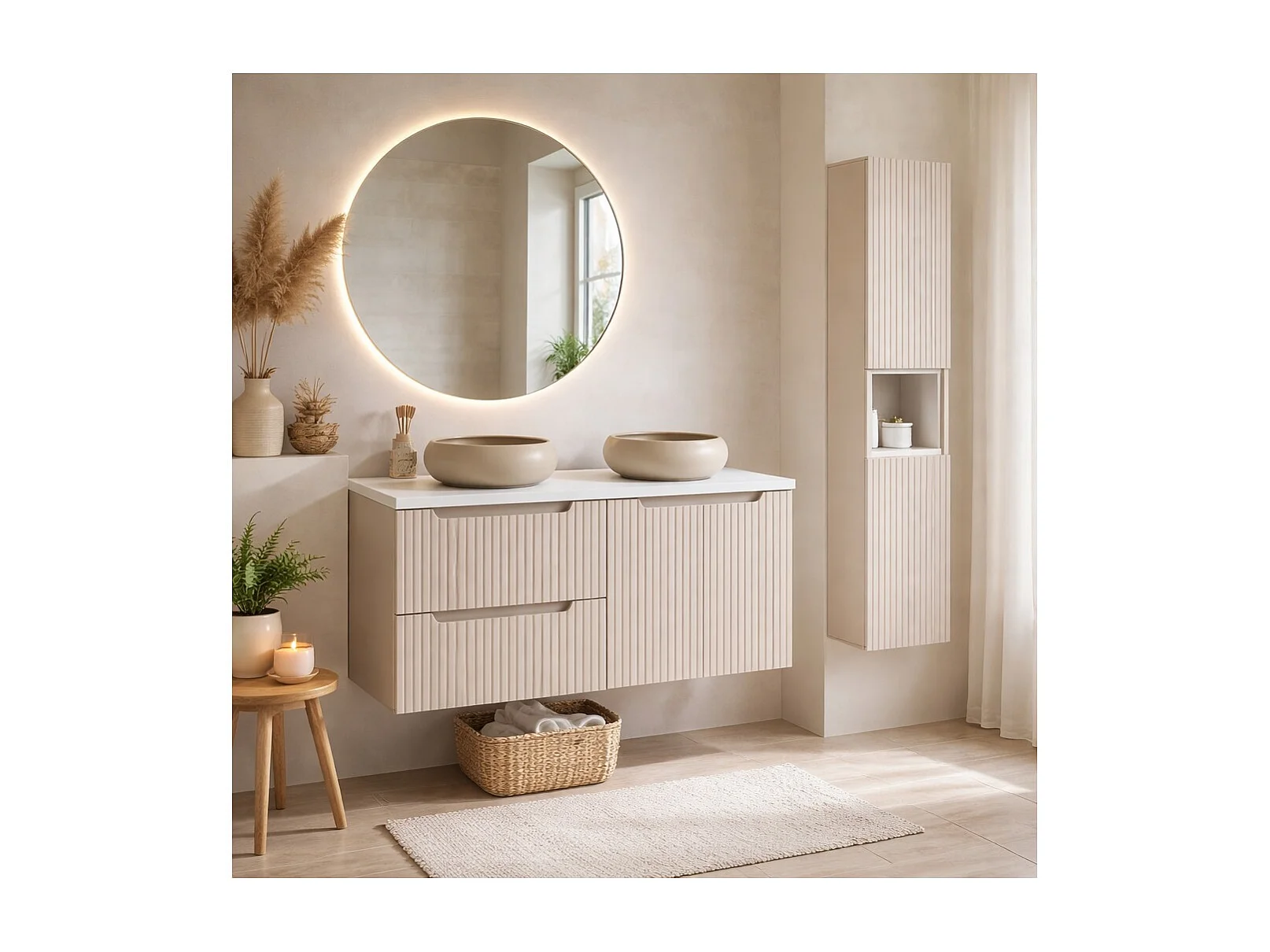 Conjunto VANO cachemira y blanco 150cm: muebles bajo lavabo con cajones y armarios + lavabos sobre encimera marrón capuchino + columna