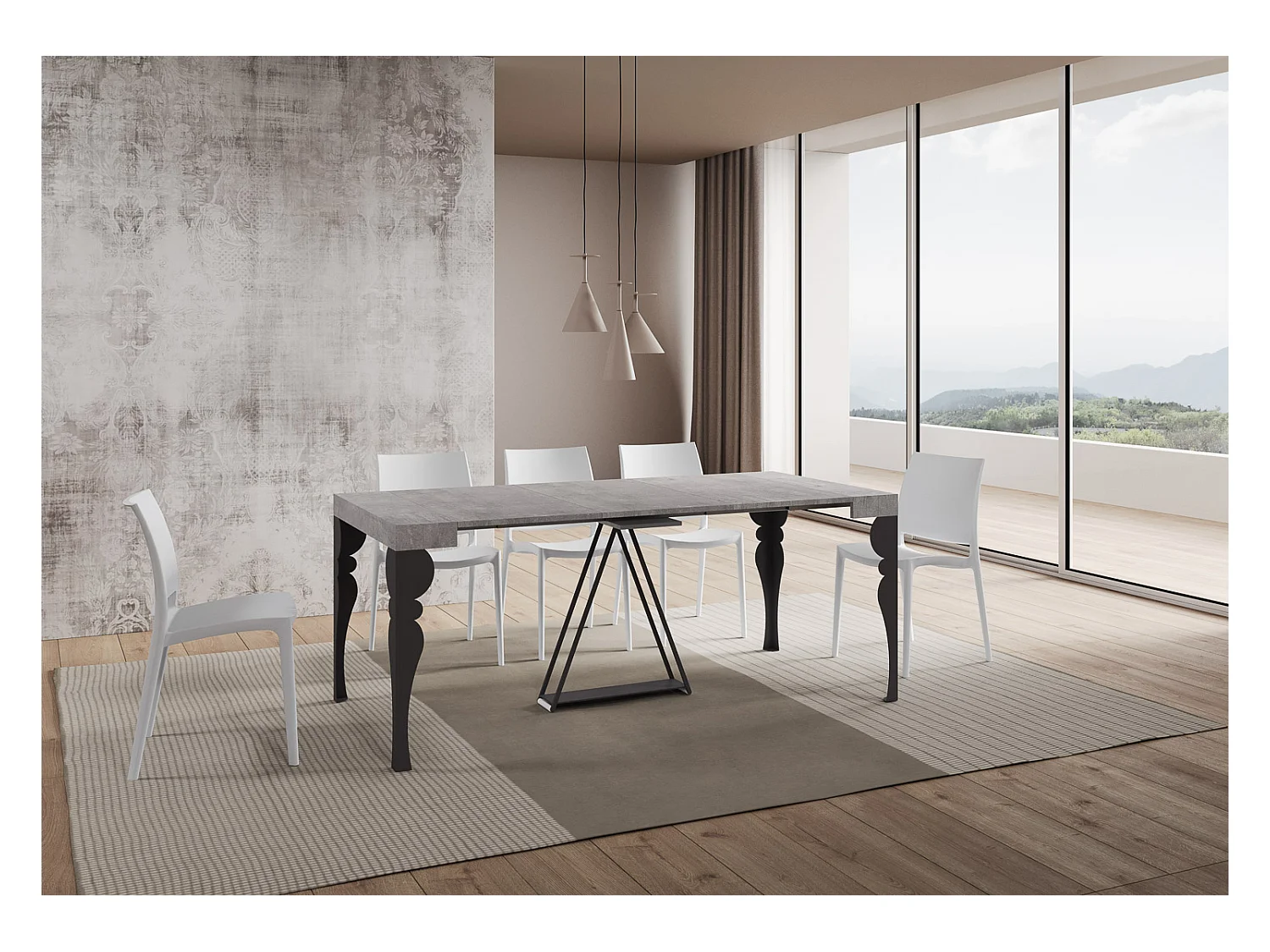 Consola extensible en madera y acero antracita Elvira 90x40/196 o 90x40/300 cm-Color Gris cemento-Soporte 2 pies-Alargaderas 3 extensiones