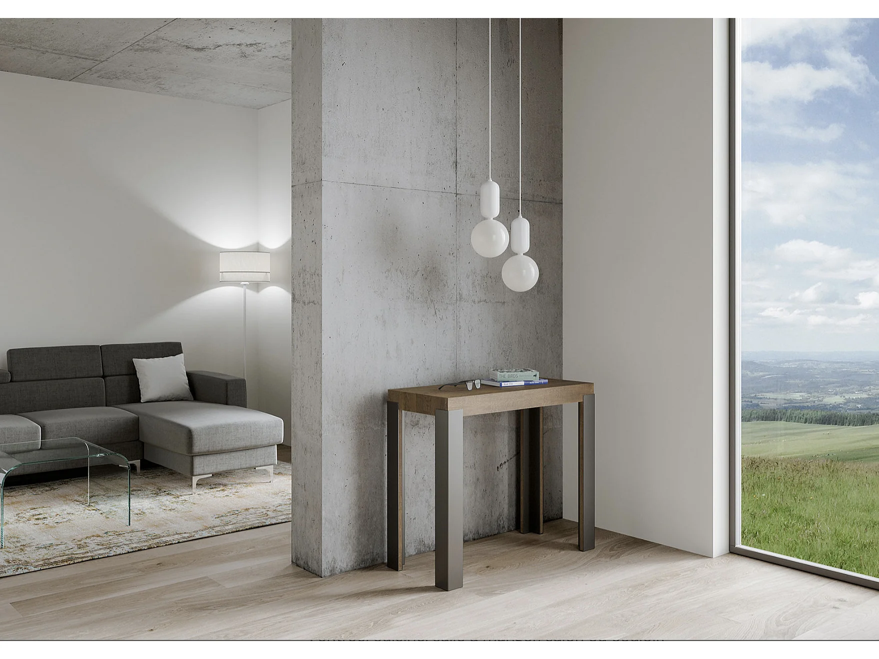 Consola extensible de madera con 4 patas de madera y acero antracita Liva-Color Marrón-Base y soporte con ruedas-Alargaderas 5 extensiones