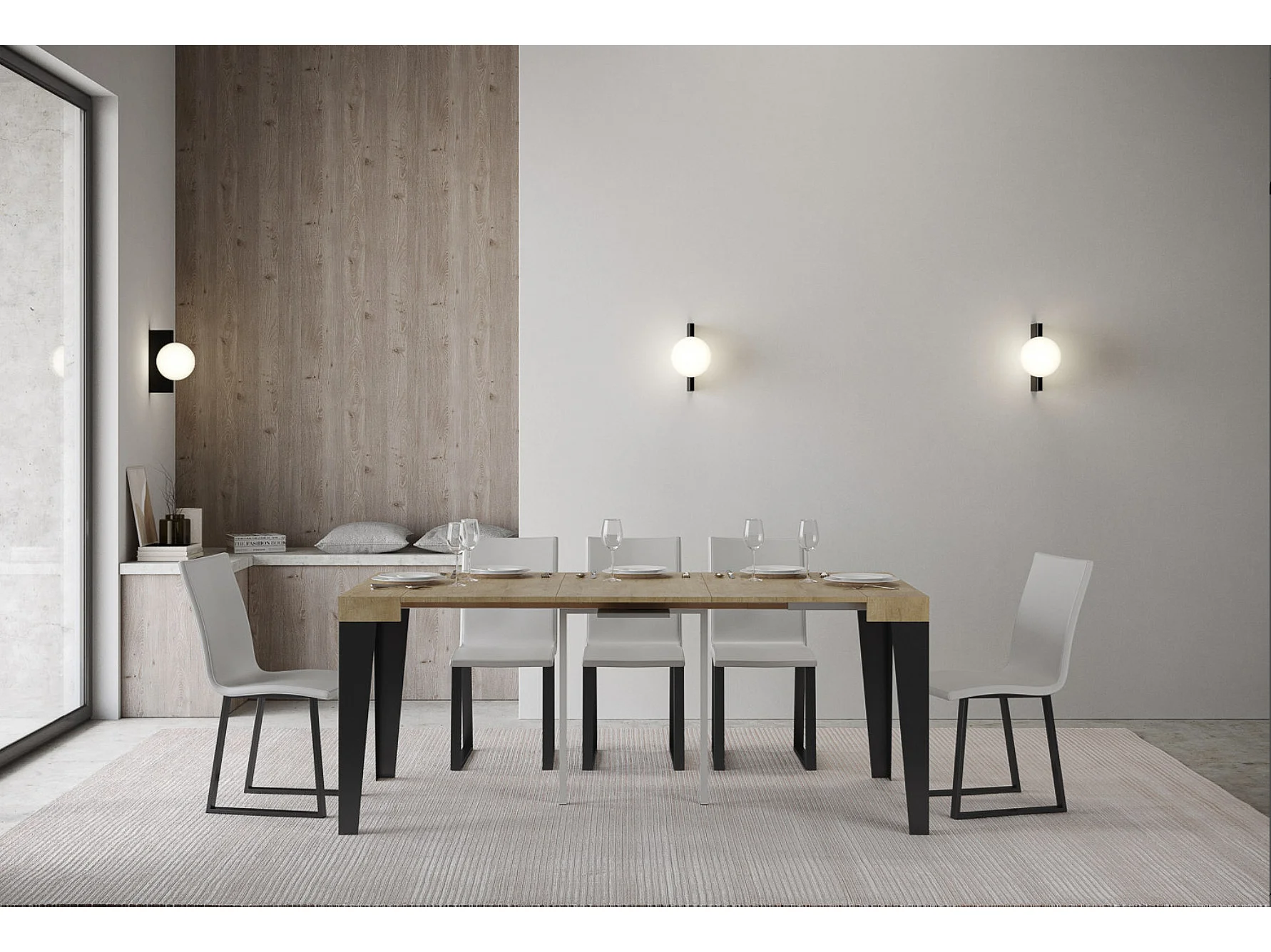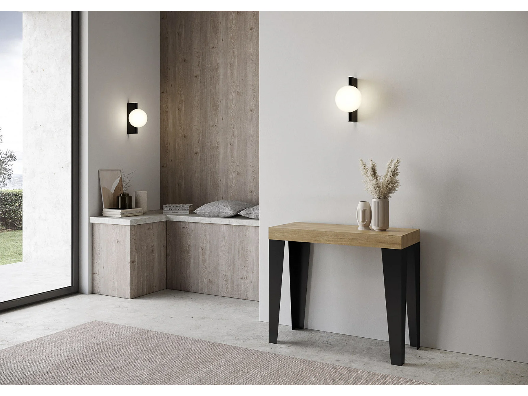 Consola extensible diseño Flavio en madera y hierro 90x40/196 o 90x40/300 cm-Color Natural-Base y soporte con ruedas-5 alargaderas finas