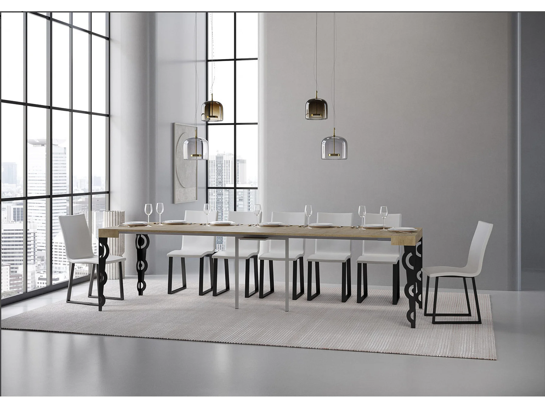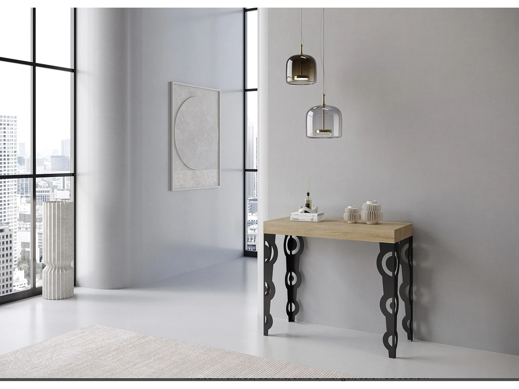 Consola extensible estilo oriental Kazay 90x40/196 o 90x40/300 cm-Color Natural-Base y soporte con ruedas-3 alargaderas finas