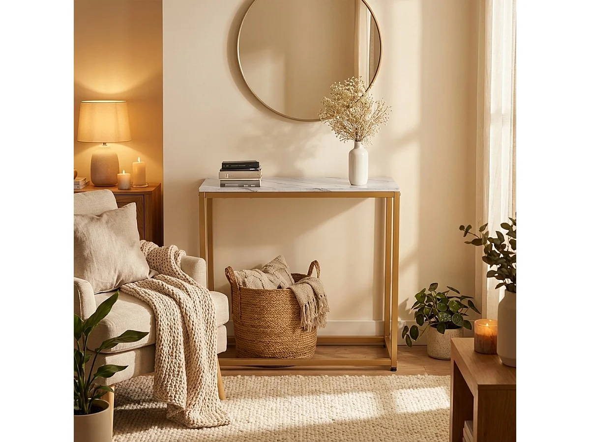 Consola moderna para recibidor móvil de metal 80x30x75cm Nigel - Efecto mármol blanco
