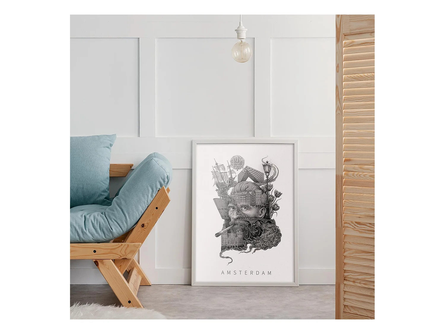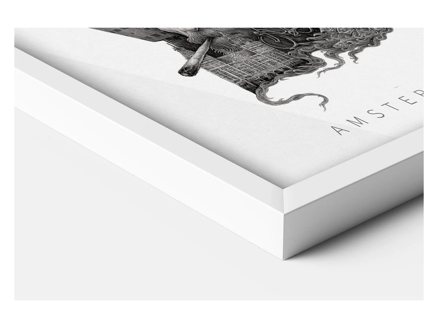 Cuadro enmarcado, elegante decoración holandesa, arte de Amsterdam marco blanco, cuadro urbano de Amsterdam de 70x100 cm.