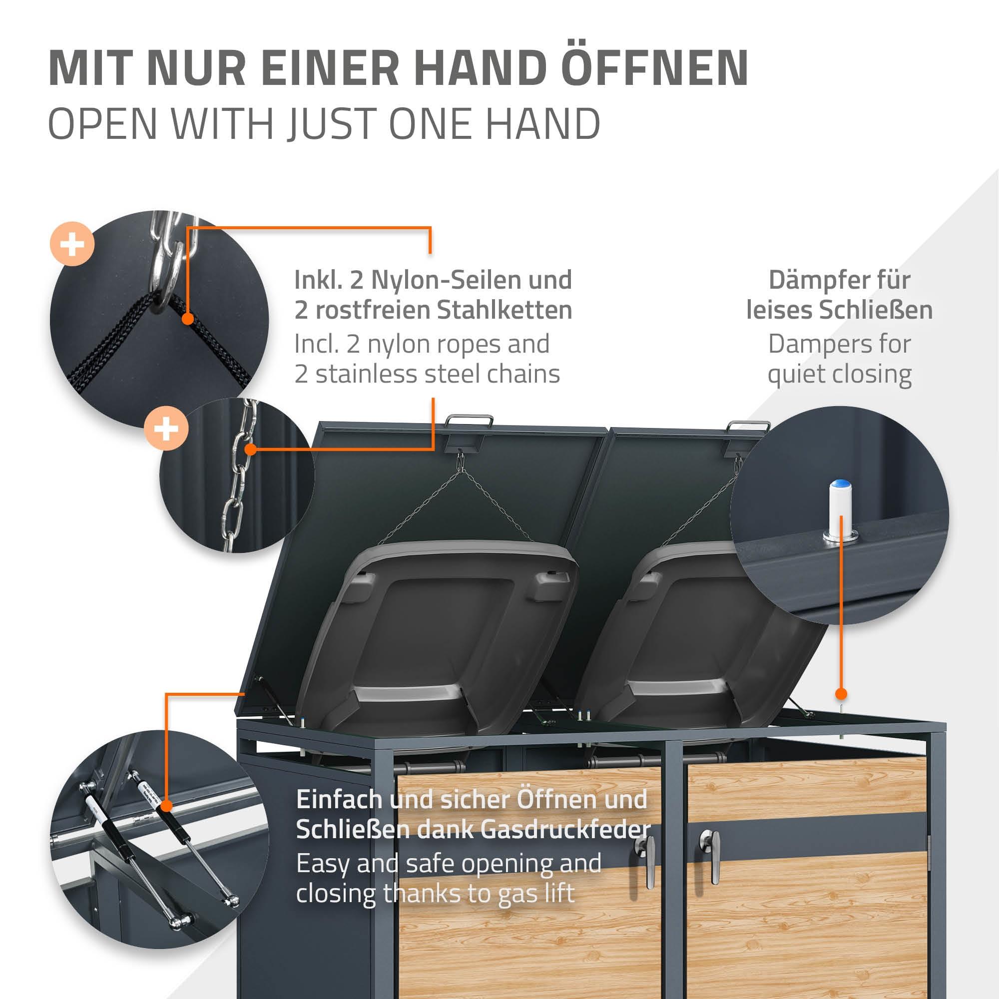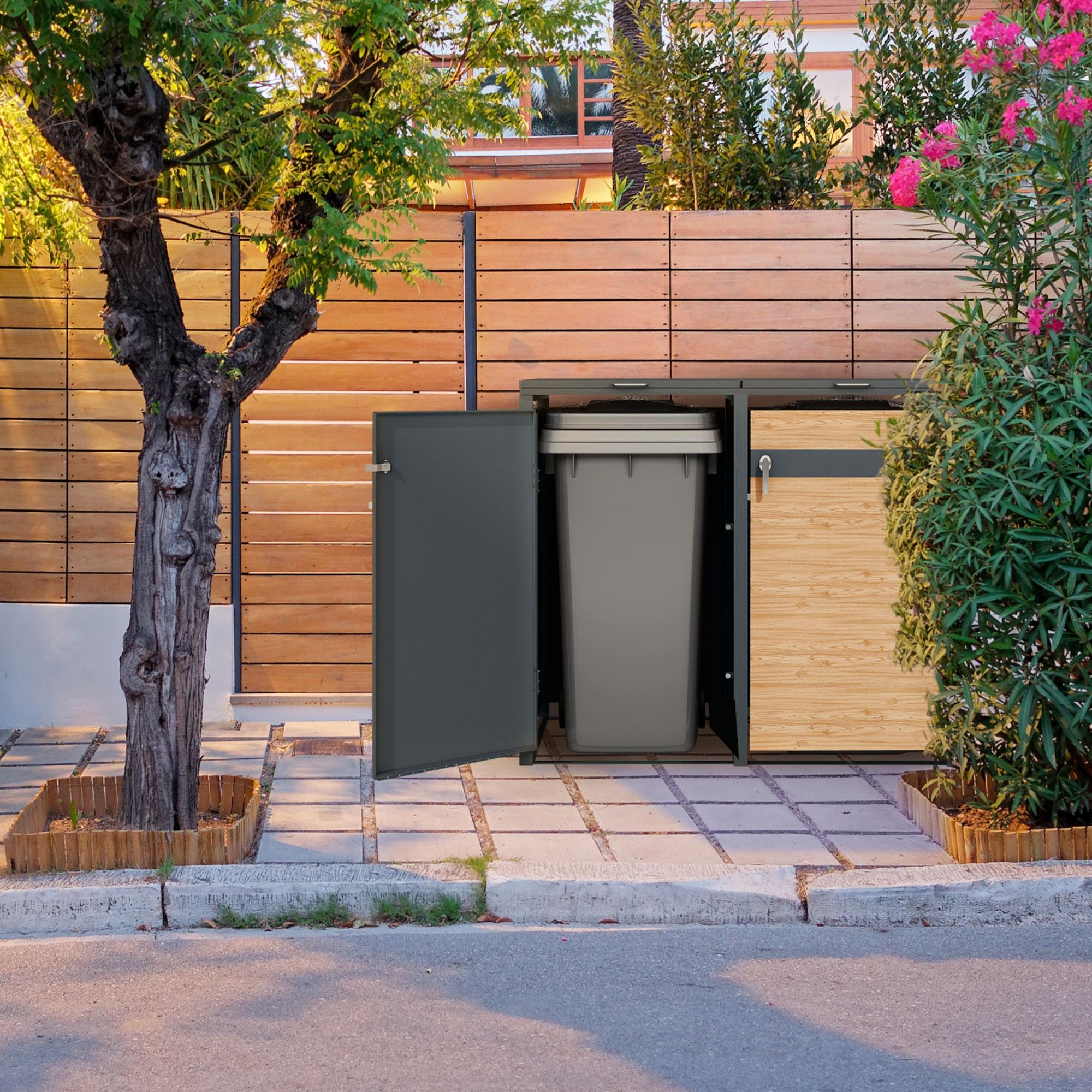 ML-Design Cobertizo exterior para ocultar 4 cubos de basura 240L 264 x 80 x 116,3 cm antracita caseta de acero con aspecto roble