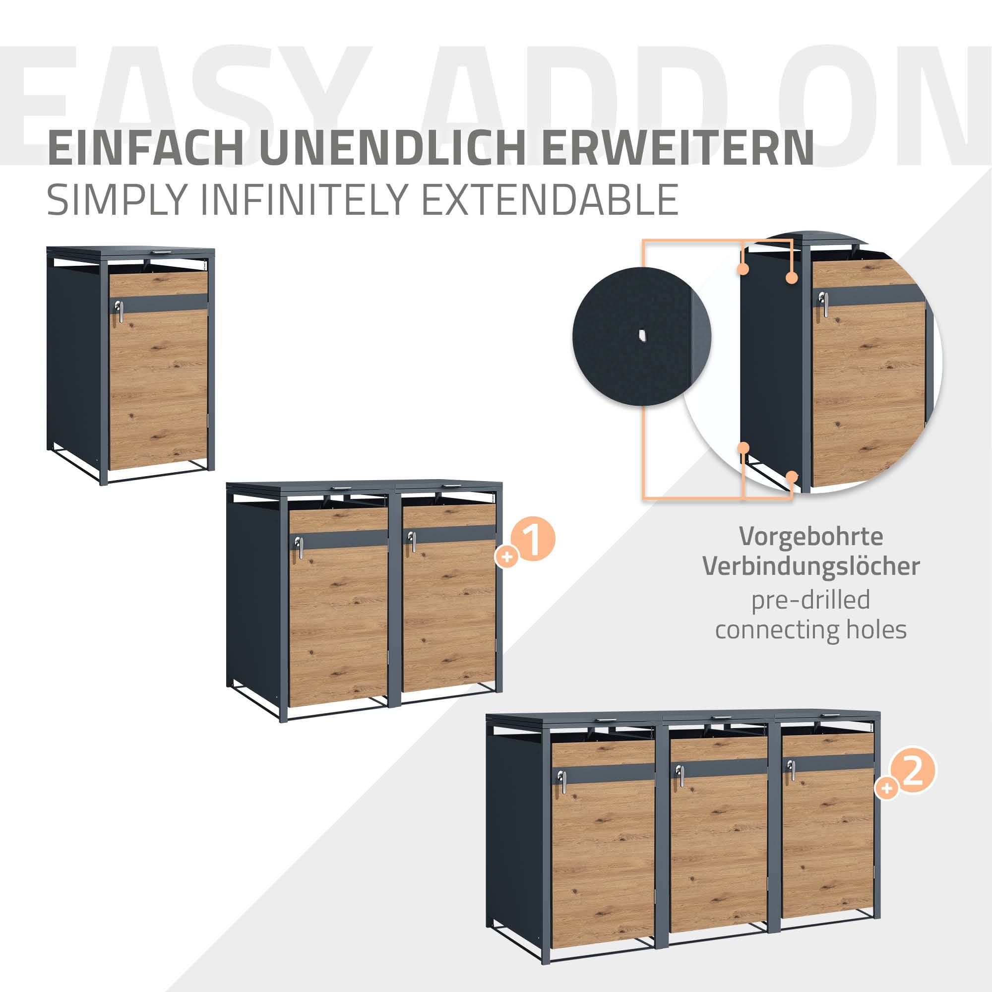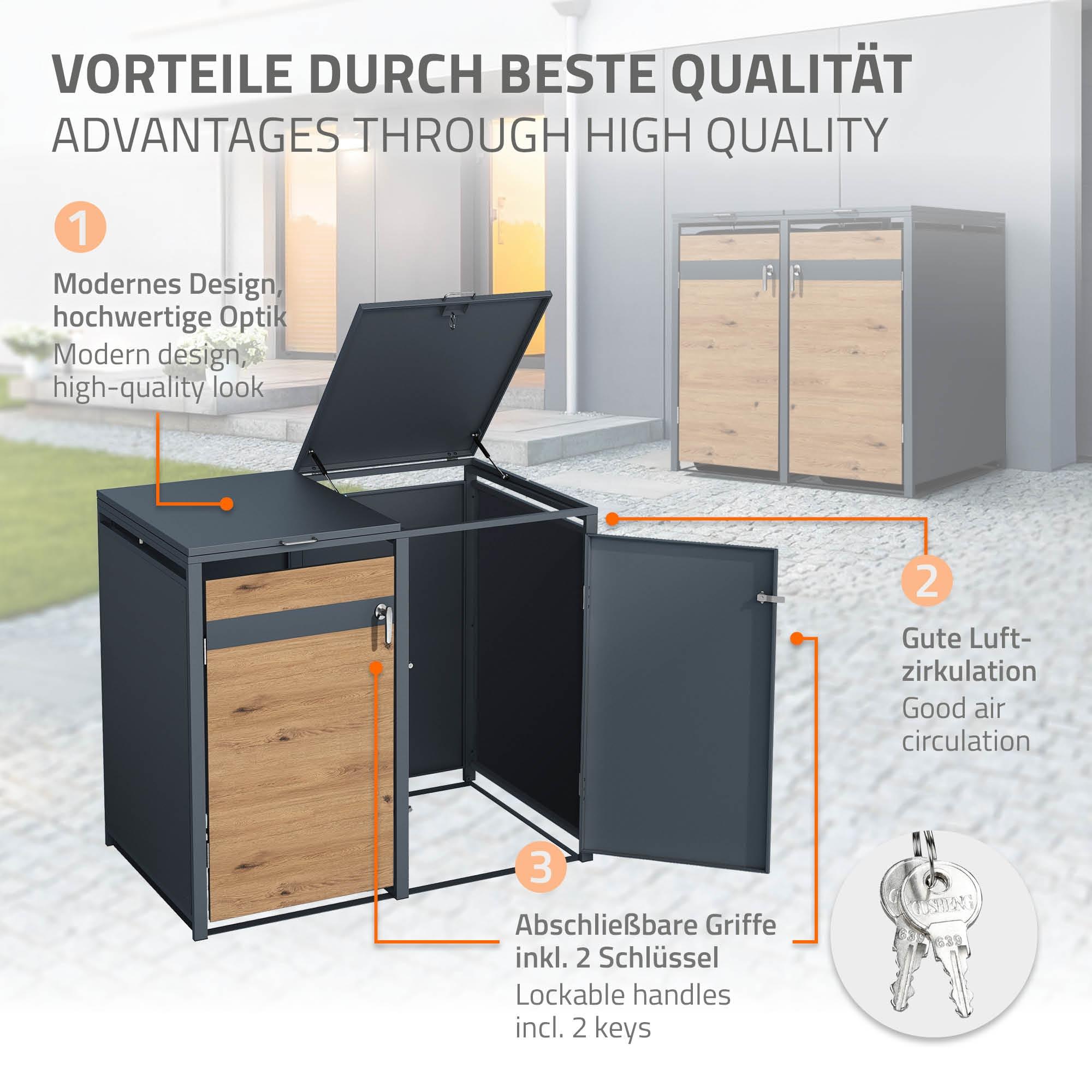 ML-Design Cobertizo de exterior para 3 cubos de basura de 240L 200x80x116,3cm acero antracita aspecto roble cubre contenedor con tapa y puerta abatib