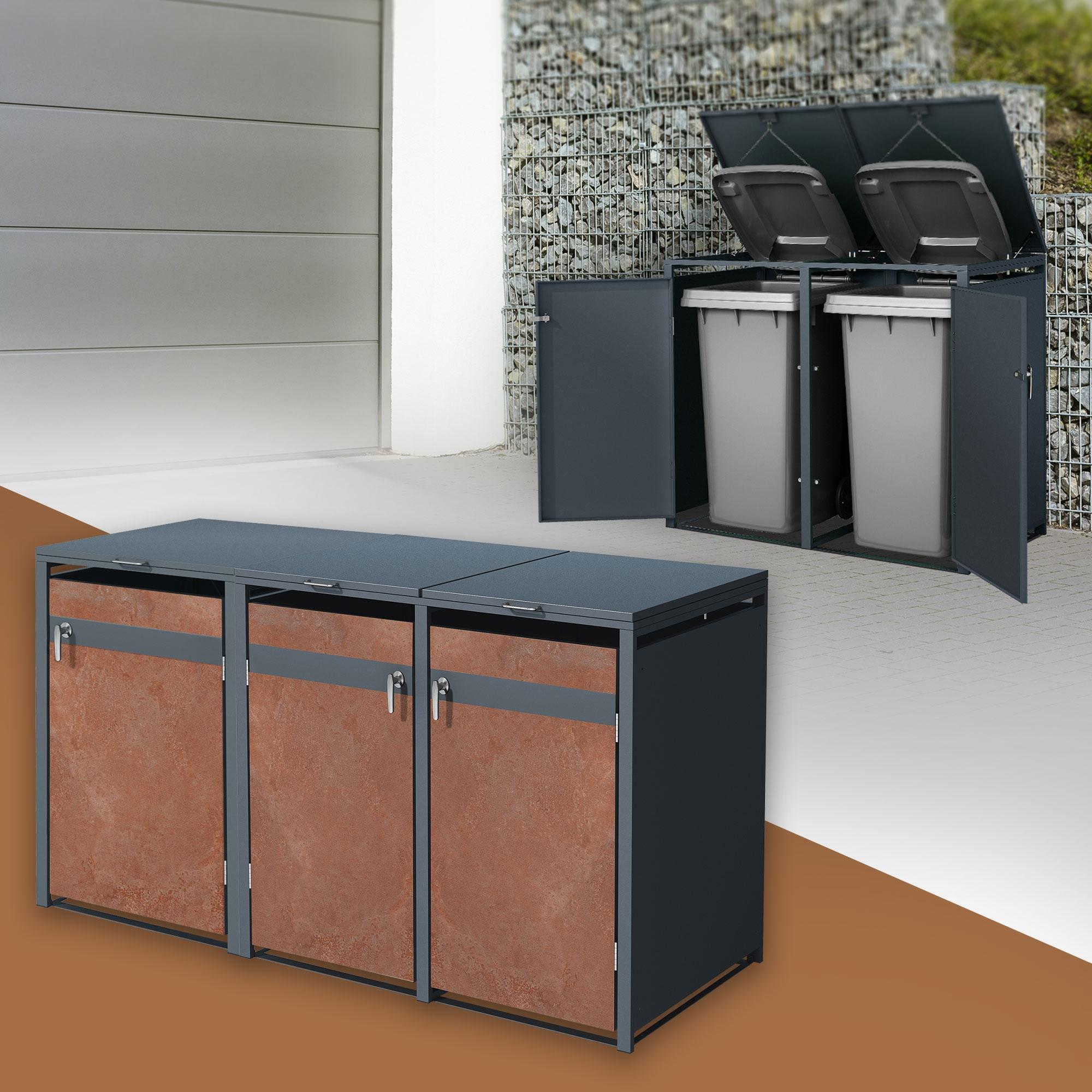 ML-Design Cobertizo de exterior para 3 cubos de basura de 200x80x116,3cm antracita y marrón óxido cubre contenedor con tapa, puerta y cerradura