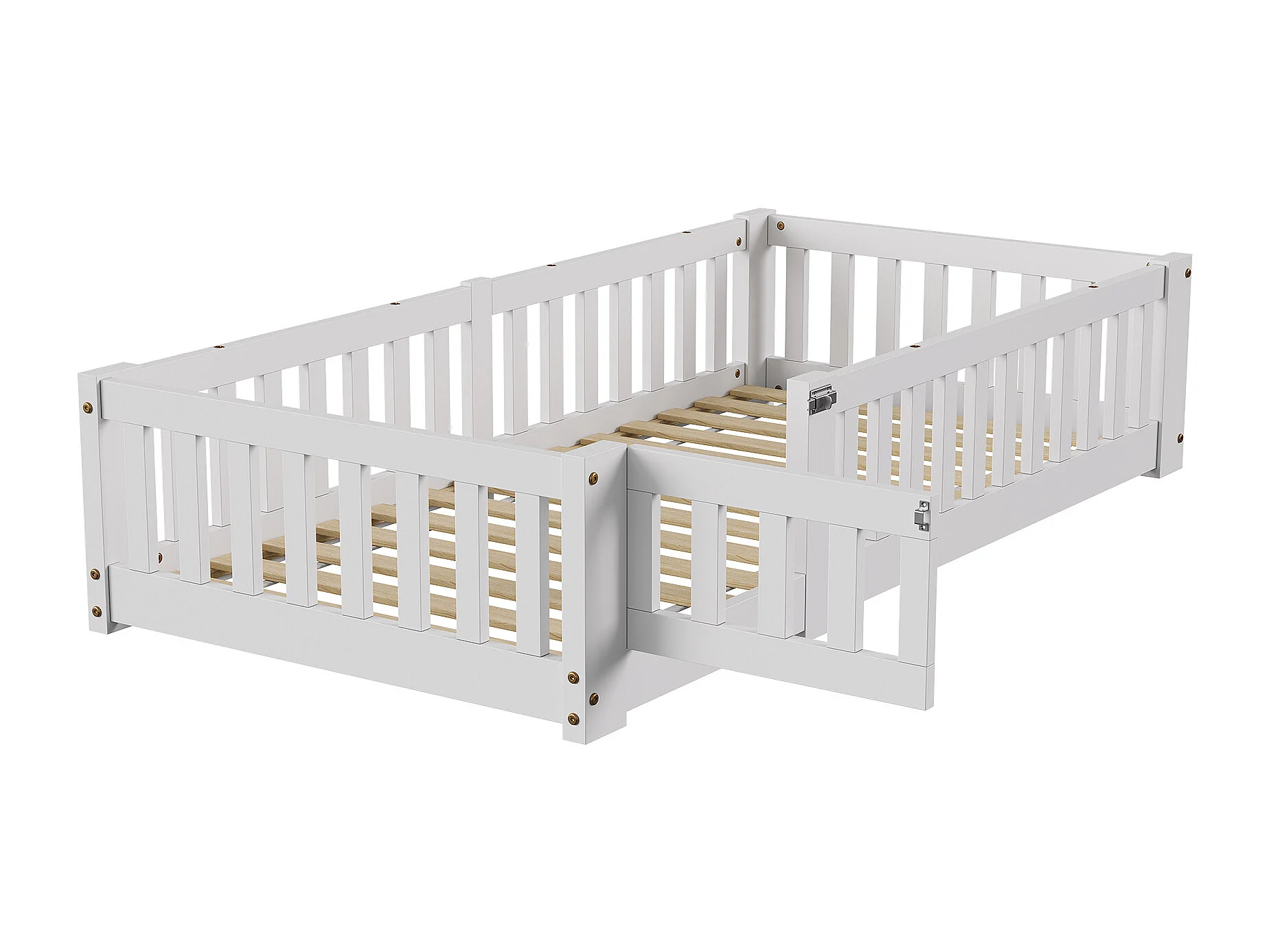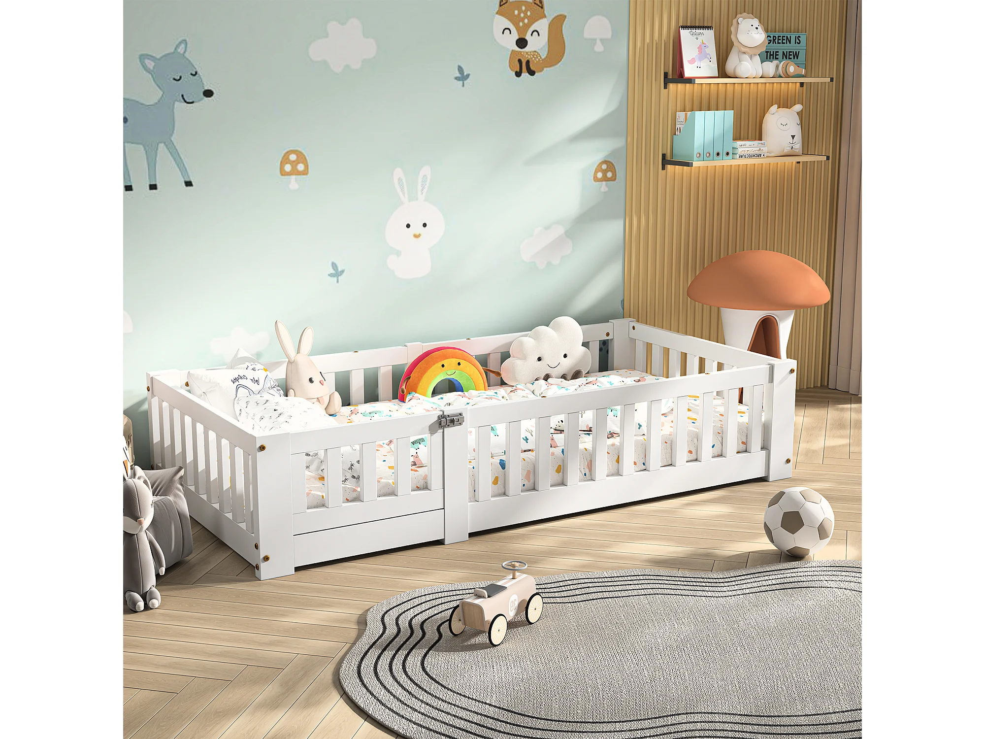 Cuna de 120x200cm con barandilla de seguridad y somier de láminas, estructura de cama individual para niños y niñas, bebés y niños pequeños