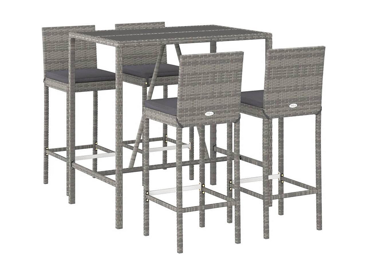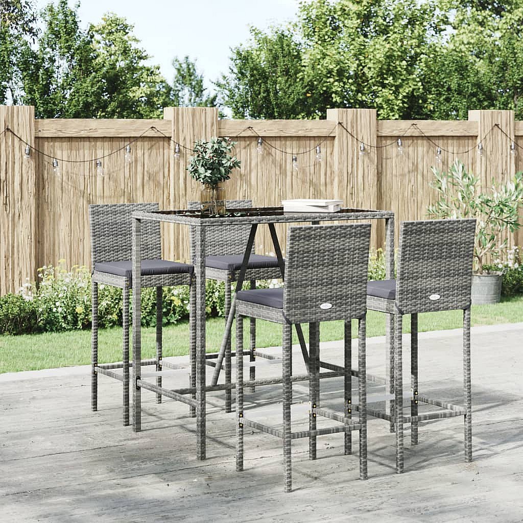 Virrat Mesa y taburetes altos jardín 5 piezas y cojines ratán PE gris