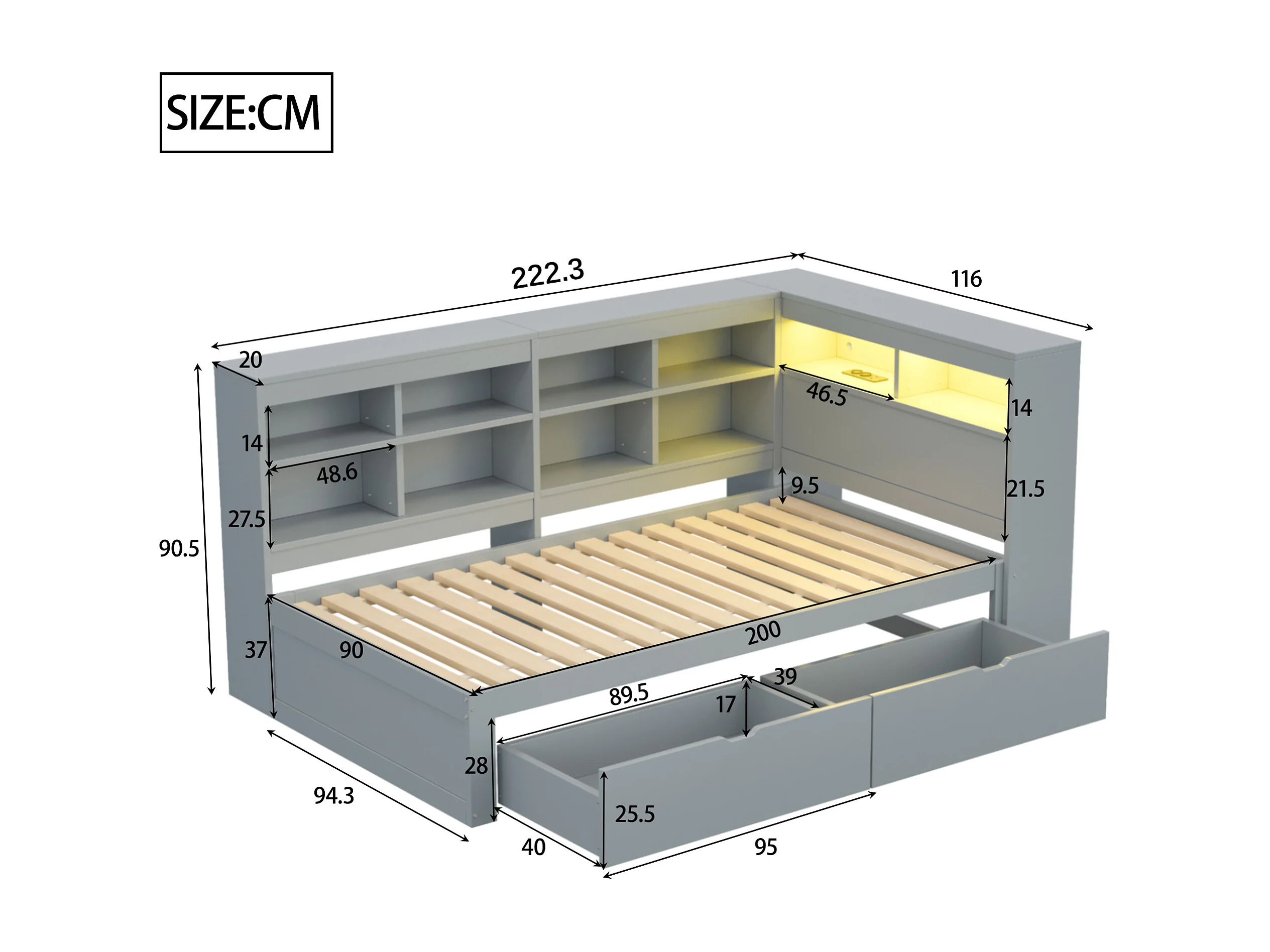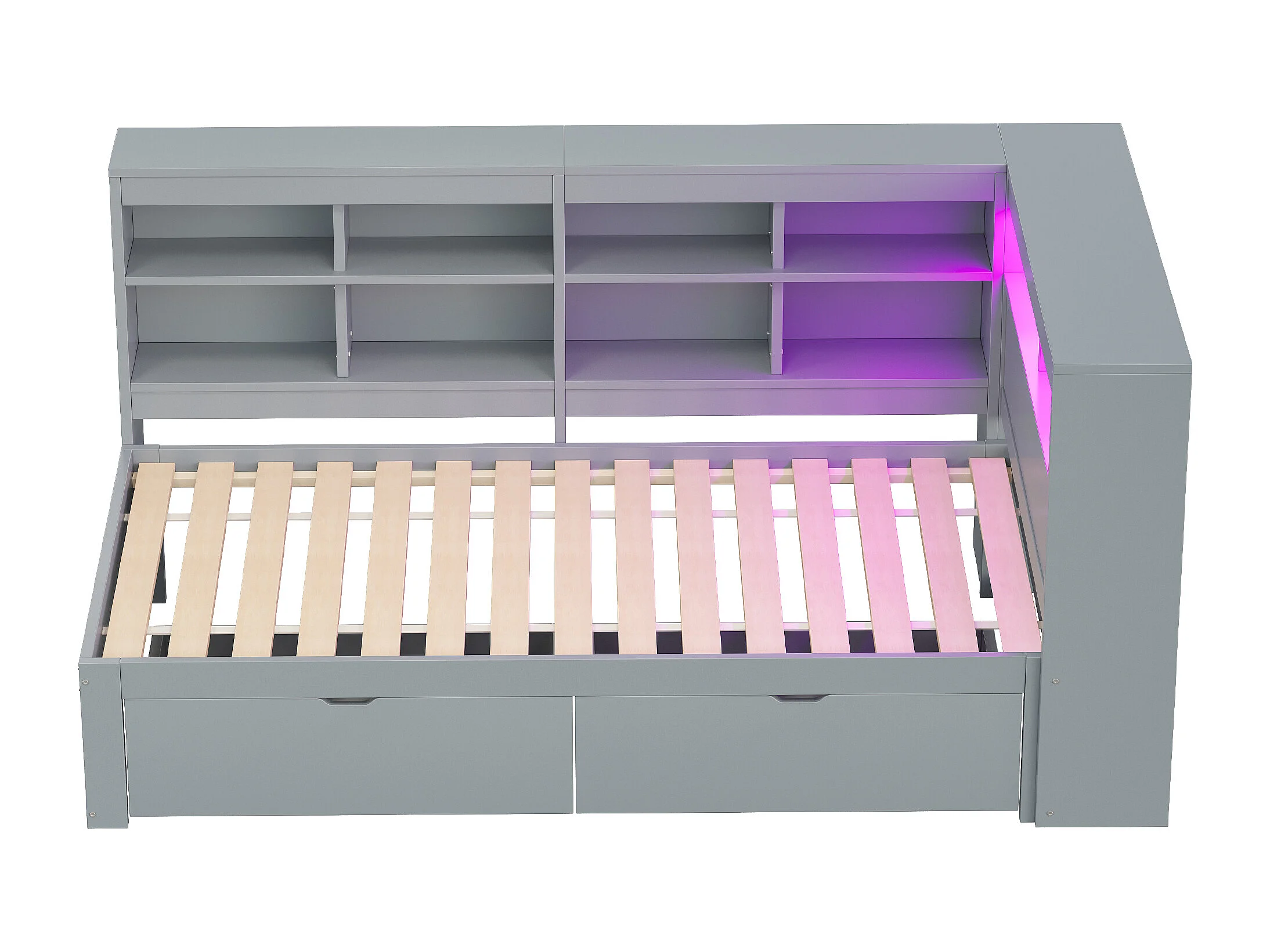 Daybed 90x200 cm con 2 cajones, puerto USB y LED - Cama individual multifuncional de madera - Gris