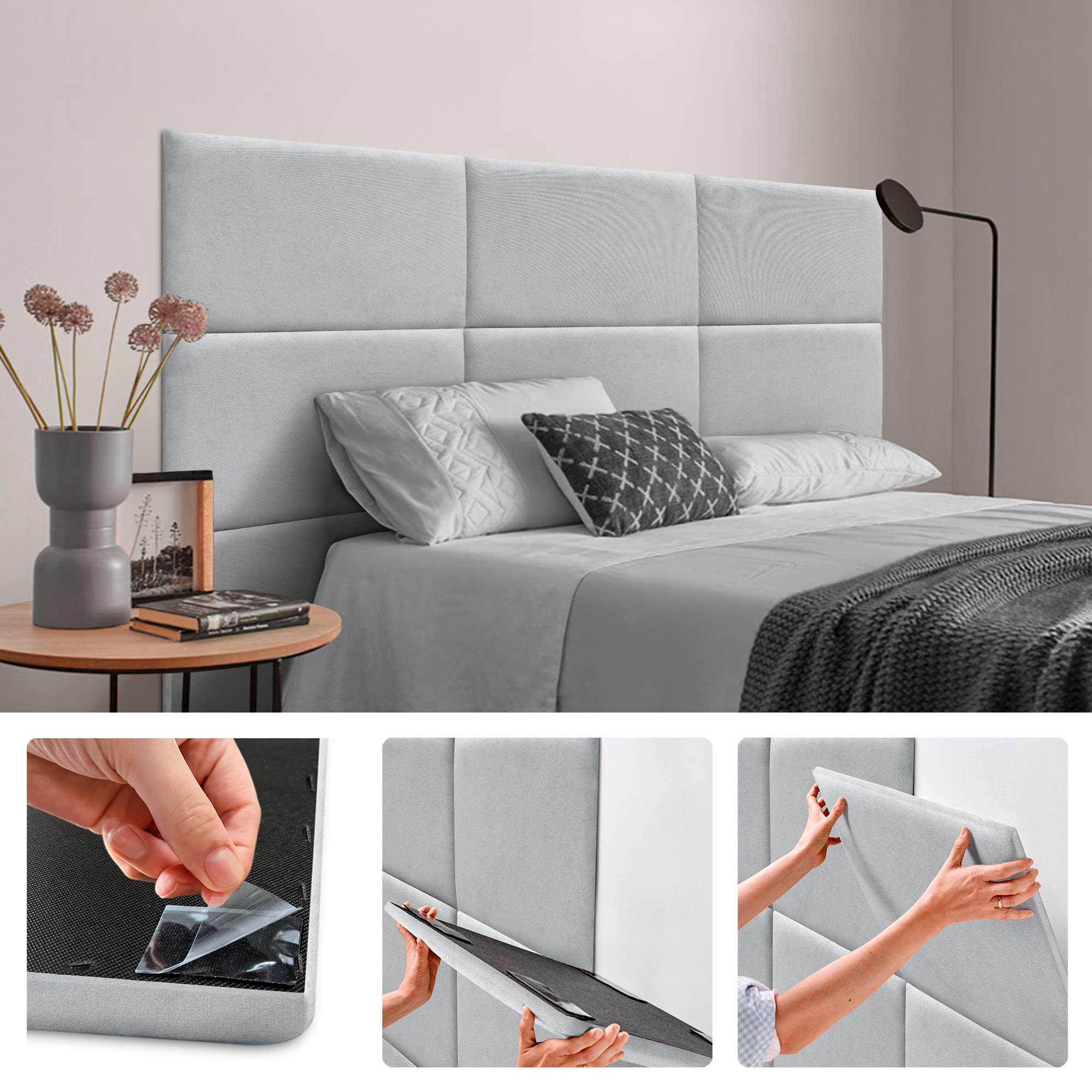 Fantástico Panel tapizado con sistema autoadhesivo de Tela Acualine para cama de matrimonio o individual, con acabado de alta gama. Con grosor de 4cm lo que brinda una gran resistencia y durabilidad. Disponible en 8 medidas: 60cm (ancho) x 4cm (profundidad) x 60cm (alto), 60cm (ancho) x 4cm (profundidad) x 50cm (alto), 60cm (ancho) x 4cm (profundidad) x 40cm (alto), 60cm (ancho) x 4cm (profundidad) x 30cm (alto), 60cm (ancho) x 4cm (profundidad) x 20cm (alto), 50cm (ancho) x 4cm (profundidad) x 50cm (alto), 50cm (ancho) x 4cm (profundidad) x 40cm (alto) y 50cm (ancho) x 4cm (profundidad) x 30cm (alto). De fácil limpieza, con tratamiento antibacteriano y antimanchas de última generación. Disponible en una amplia variedad de colores.