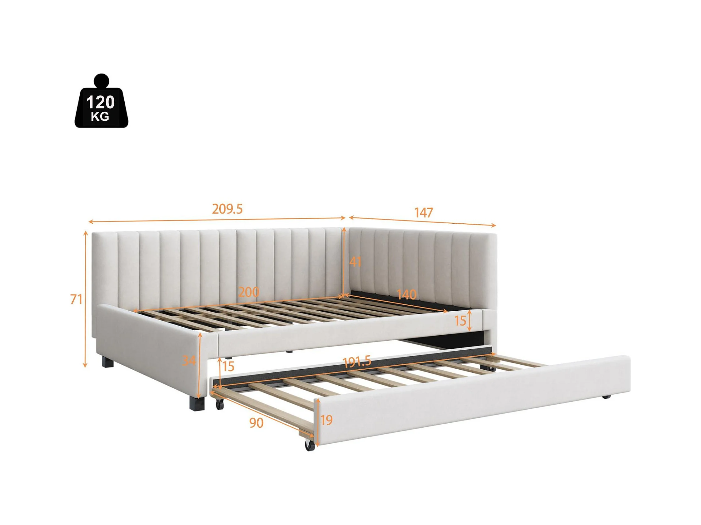 Diván tapizado 140x200 cm - con cama nido 90x190cm - tejido terciopelo - Beige