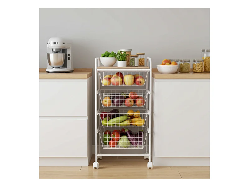 DON HIERRO - Carrito de cocina NORA, 4 cestas de gran capacidad, Encimera color Abedul efecto alistonado-Blanco