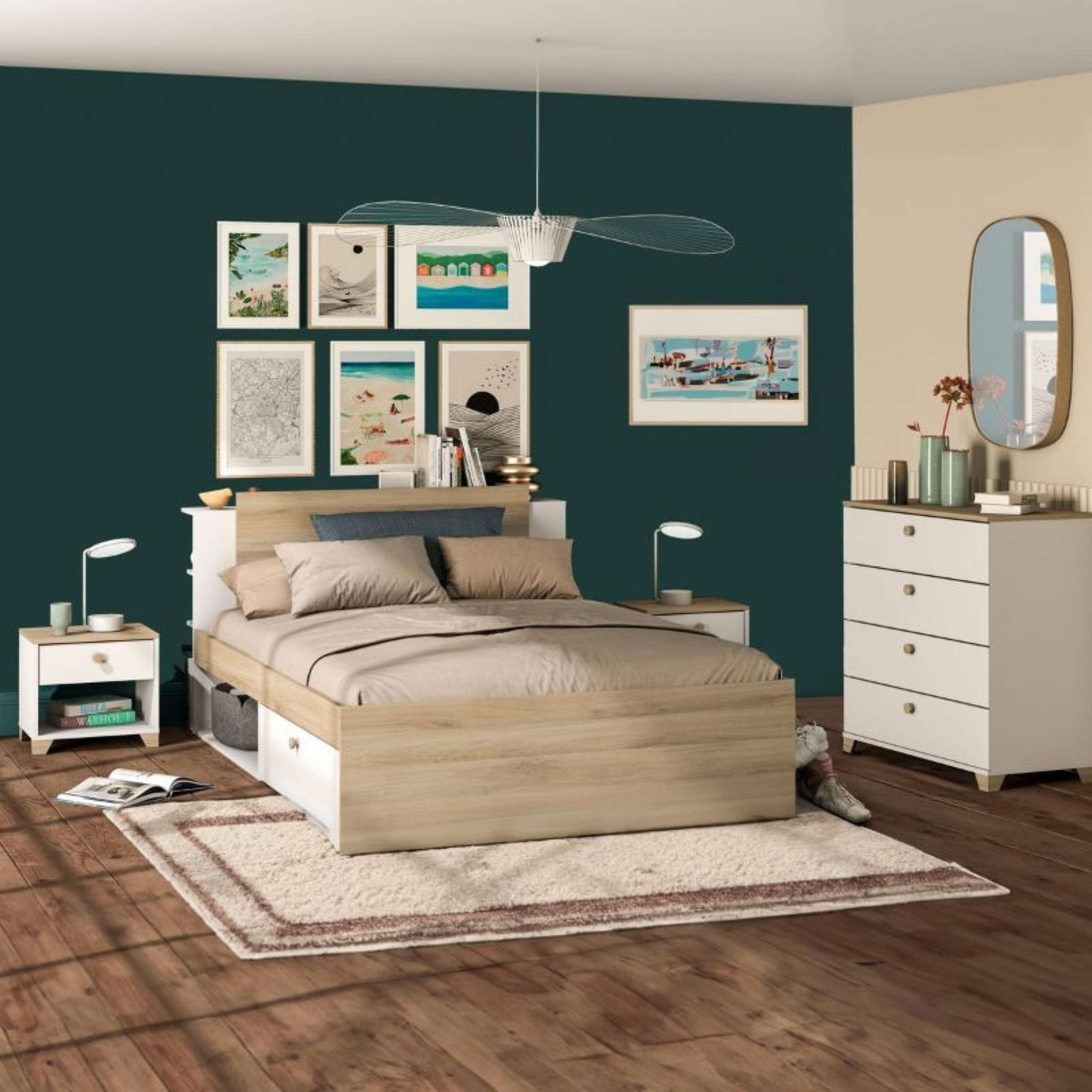 Pack Dormitorio John Cama 135-140x190 cm con Cajones y Cabecero Roble