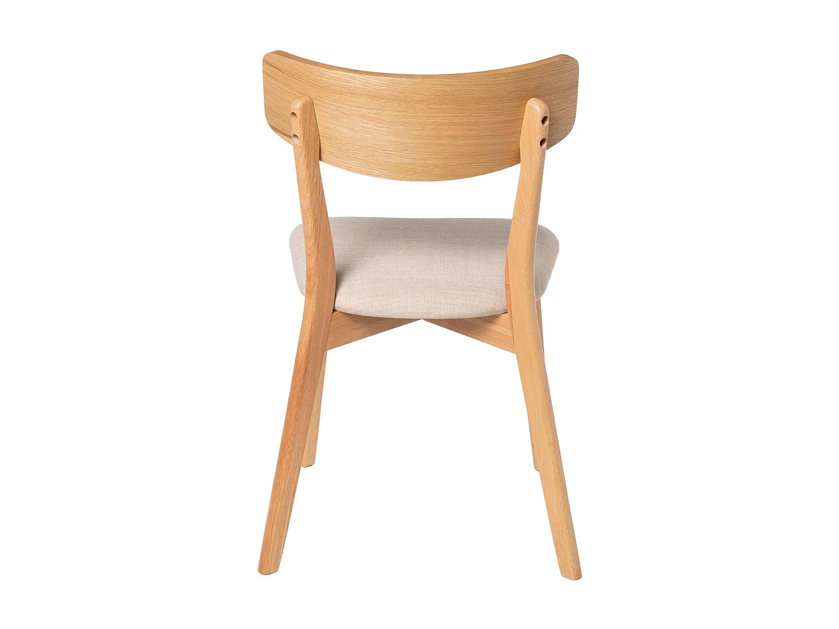 Silla de diseño Moonrise de tela beige con base chapada en nogal