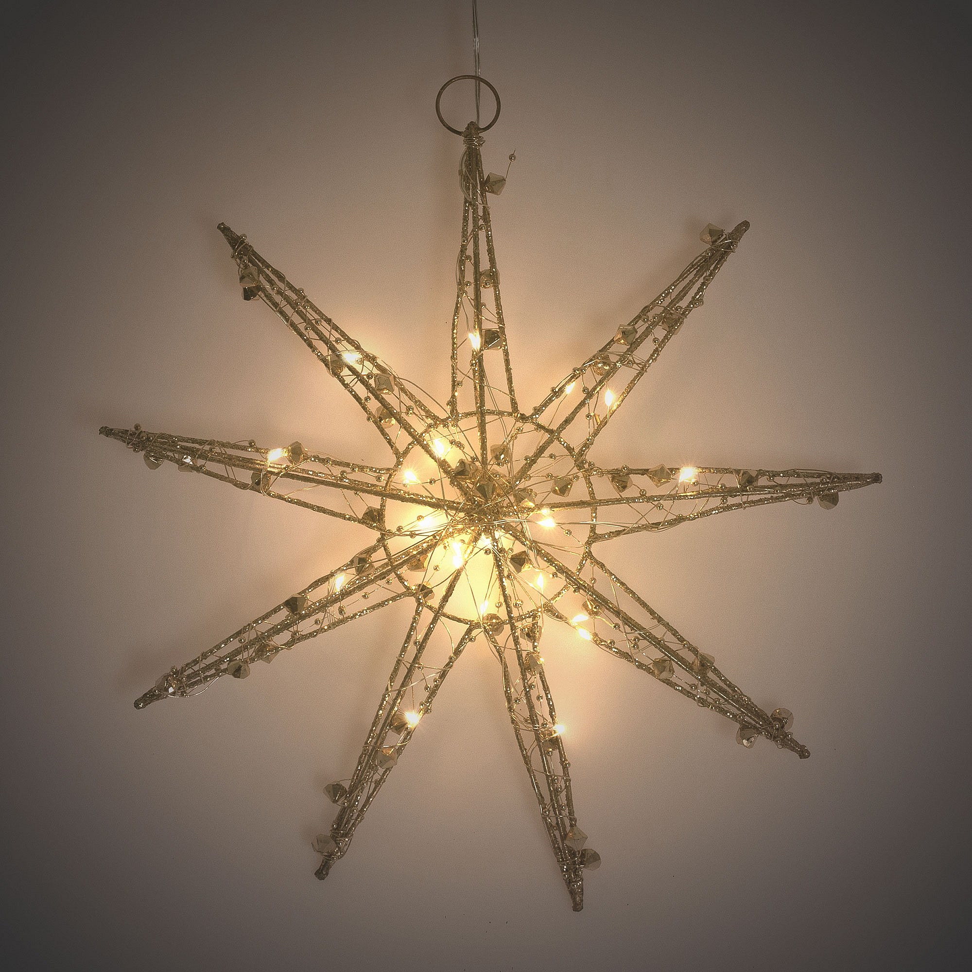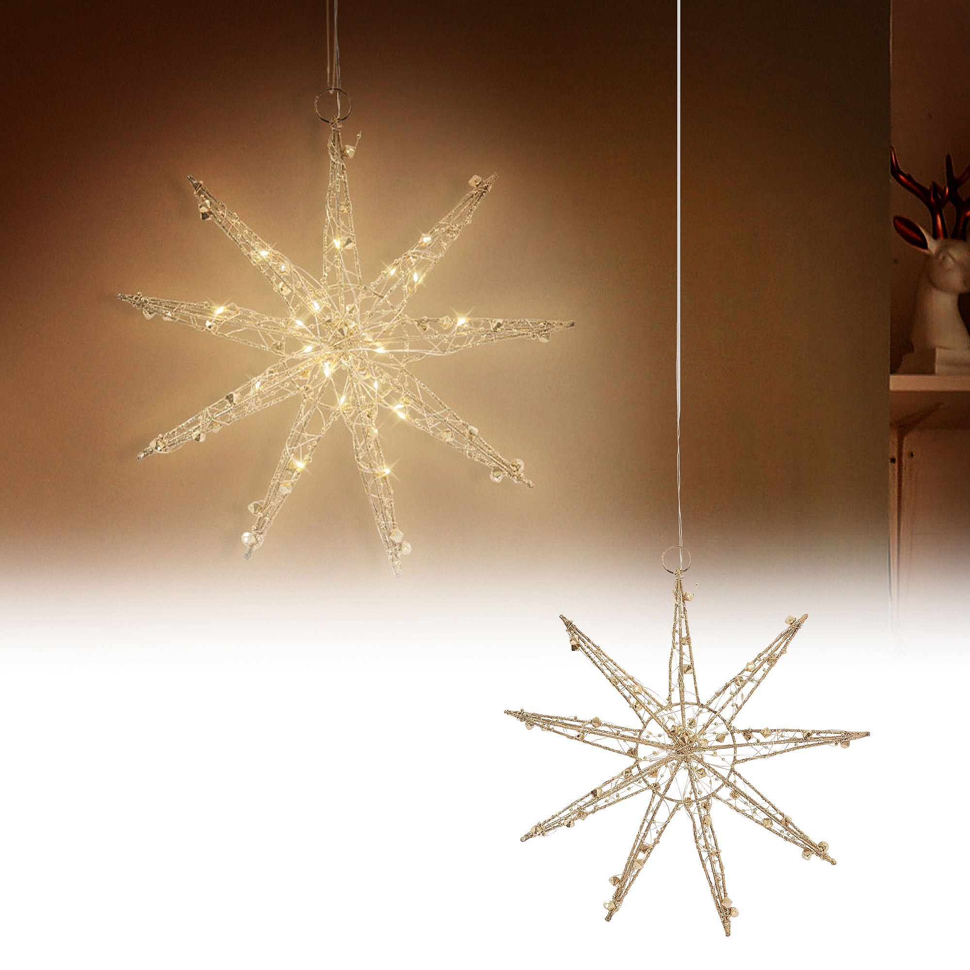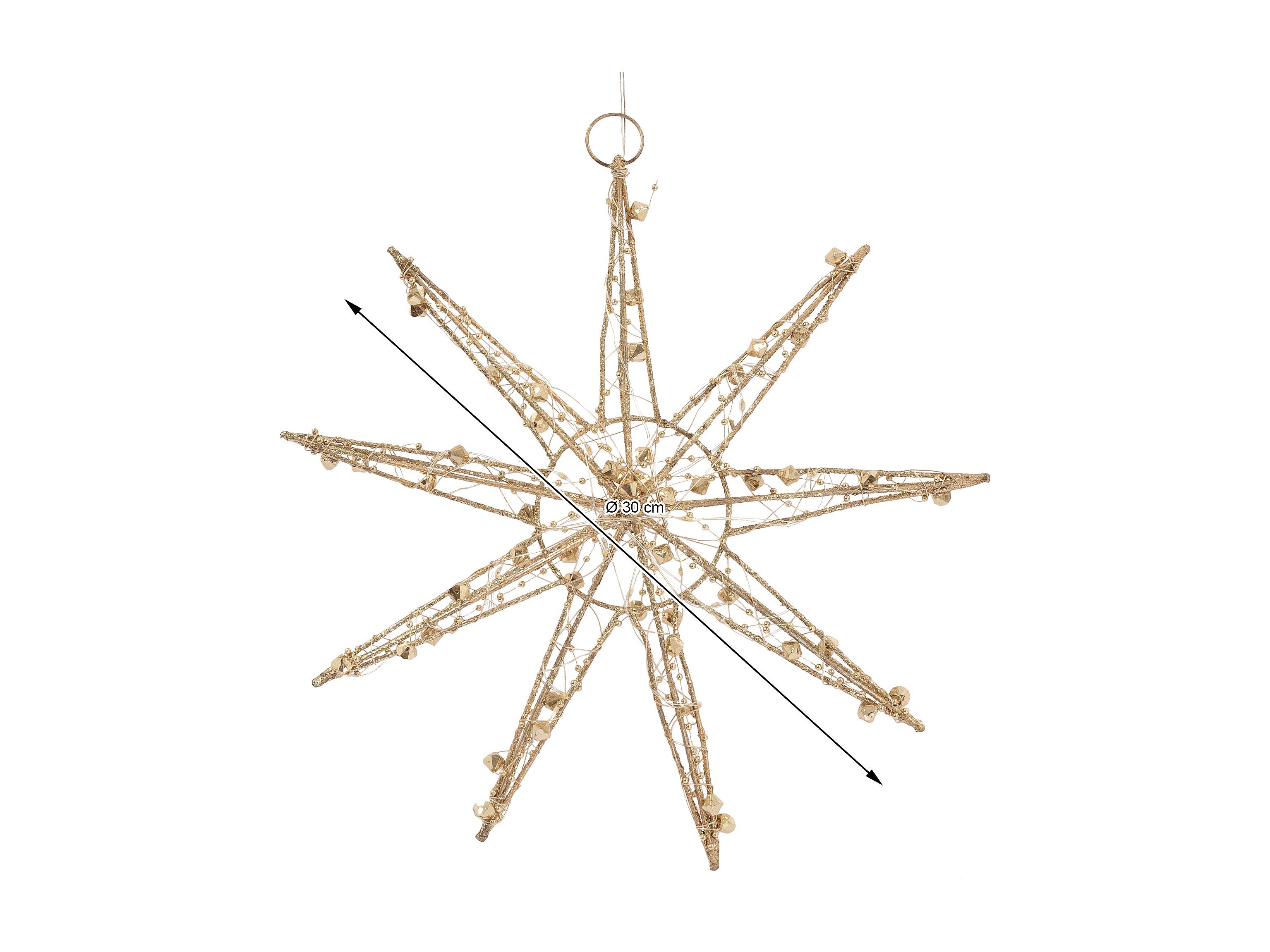 ECD Germany Decoración de Navidad Estrella colgante dorada con luces LED 30cm , copo de nieve navideño de metal con iluminación y temporizador a pilas
