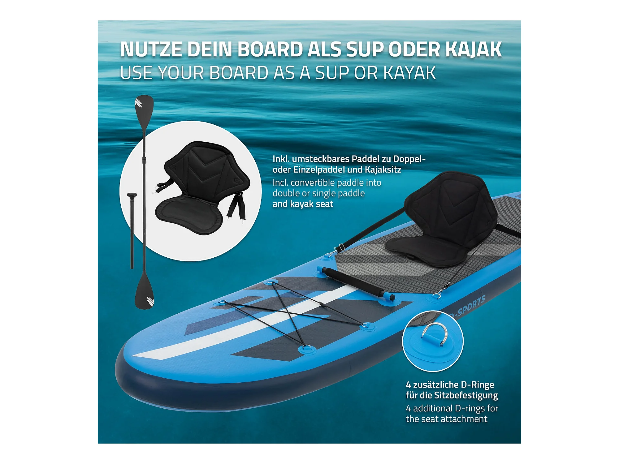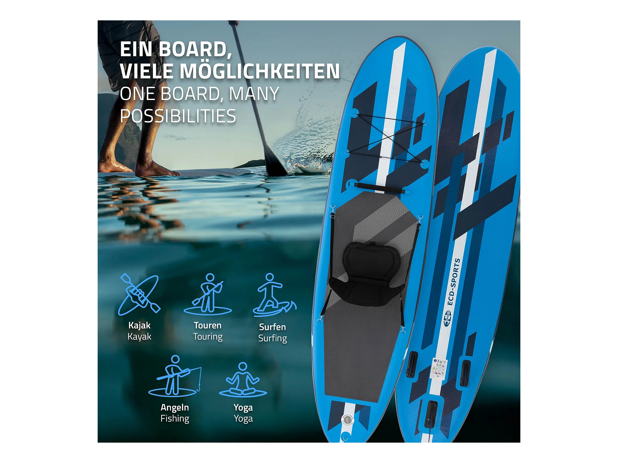 ECD Germany Tabla hinchable de paddle surf SUP 320x82x15 cm PVC azul hasta 120kg con asiento de kayak, bomba de aire, bolsa de transporte y accesorios