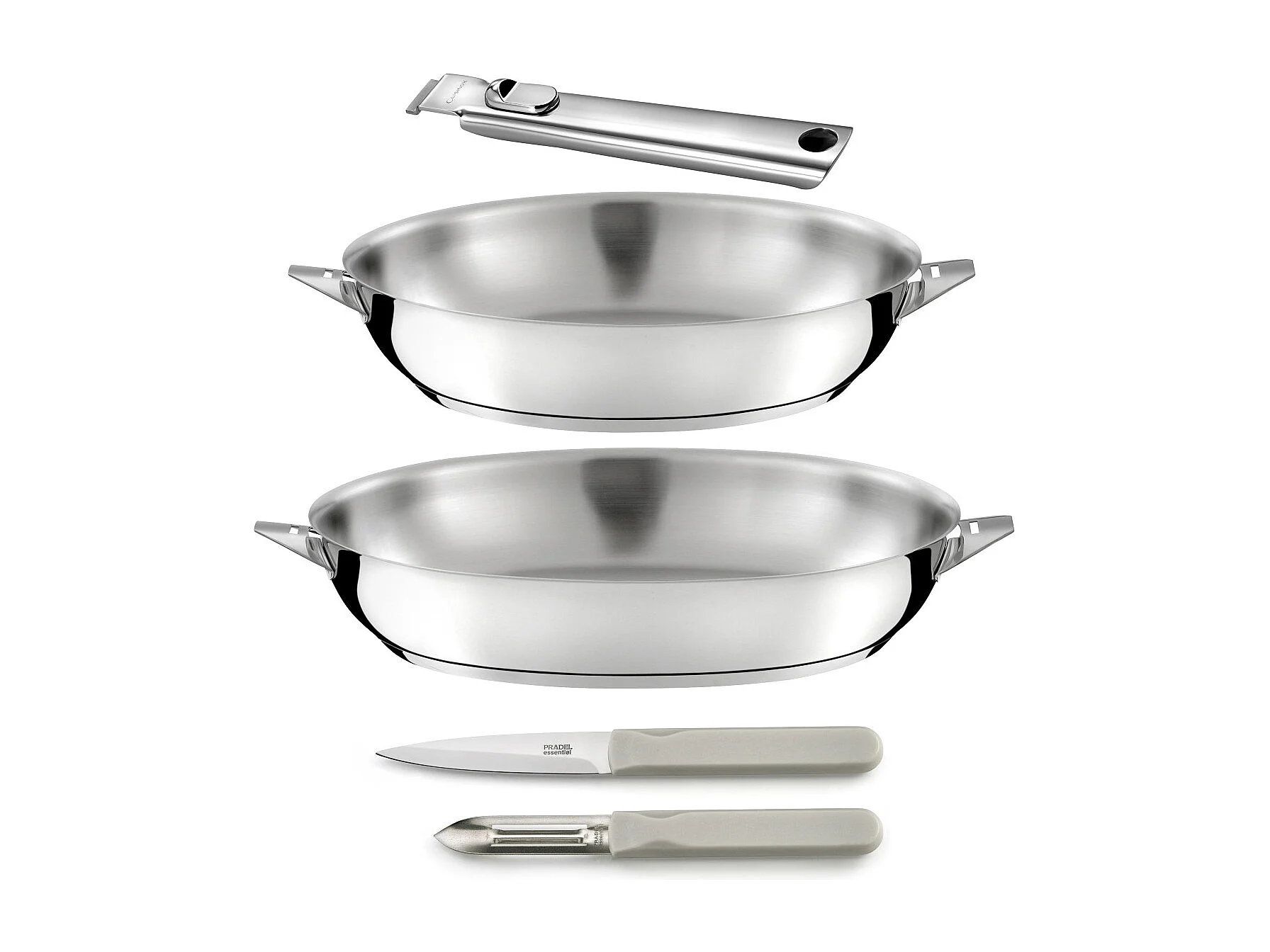 Eclipse - Set de 2 sartenes 24/28 cm inox, 1 mango desmontable, 1 pelador y 1 cuchillo