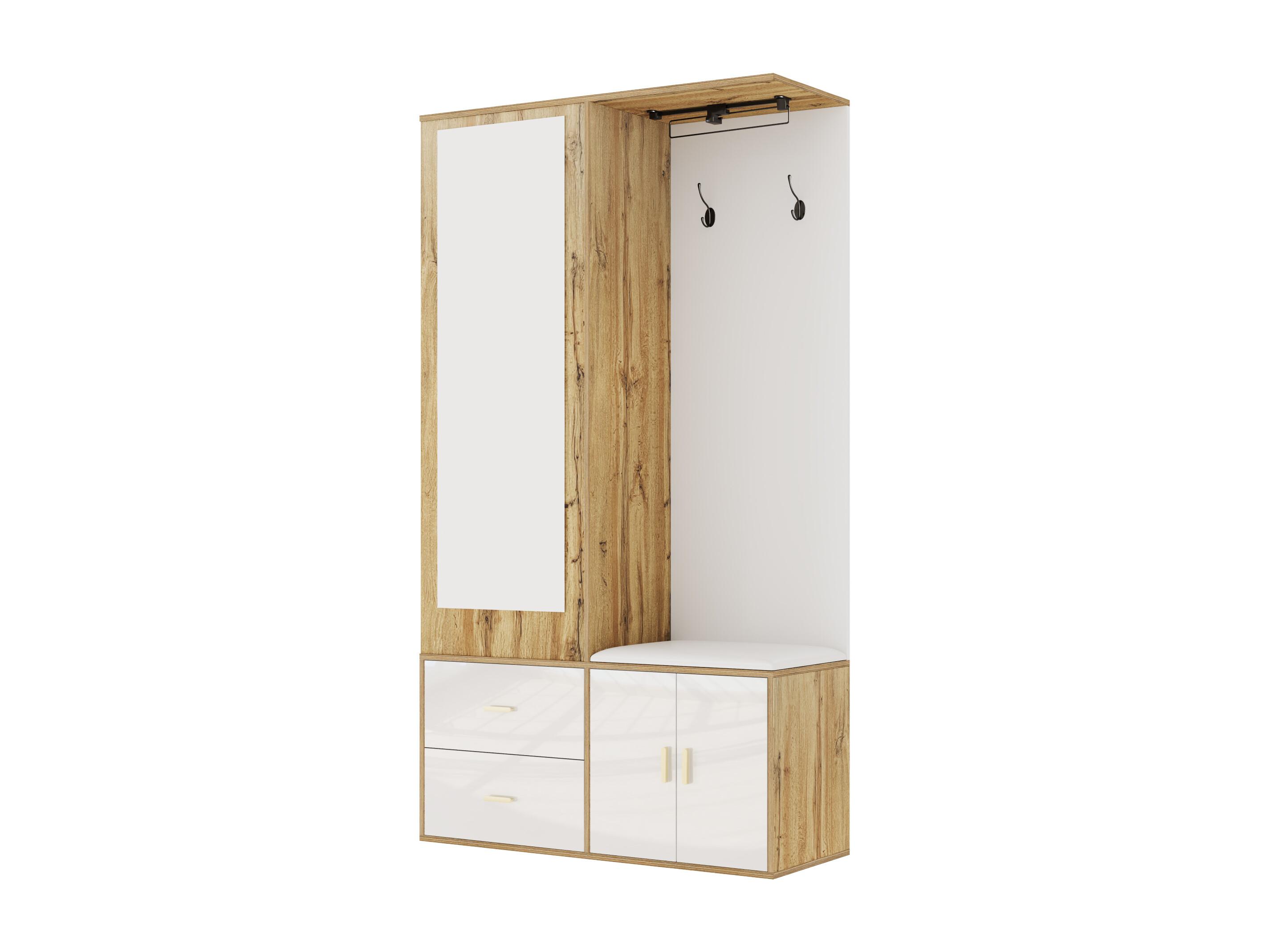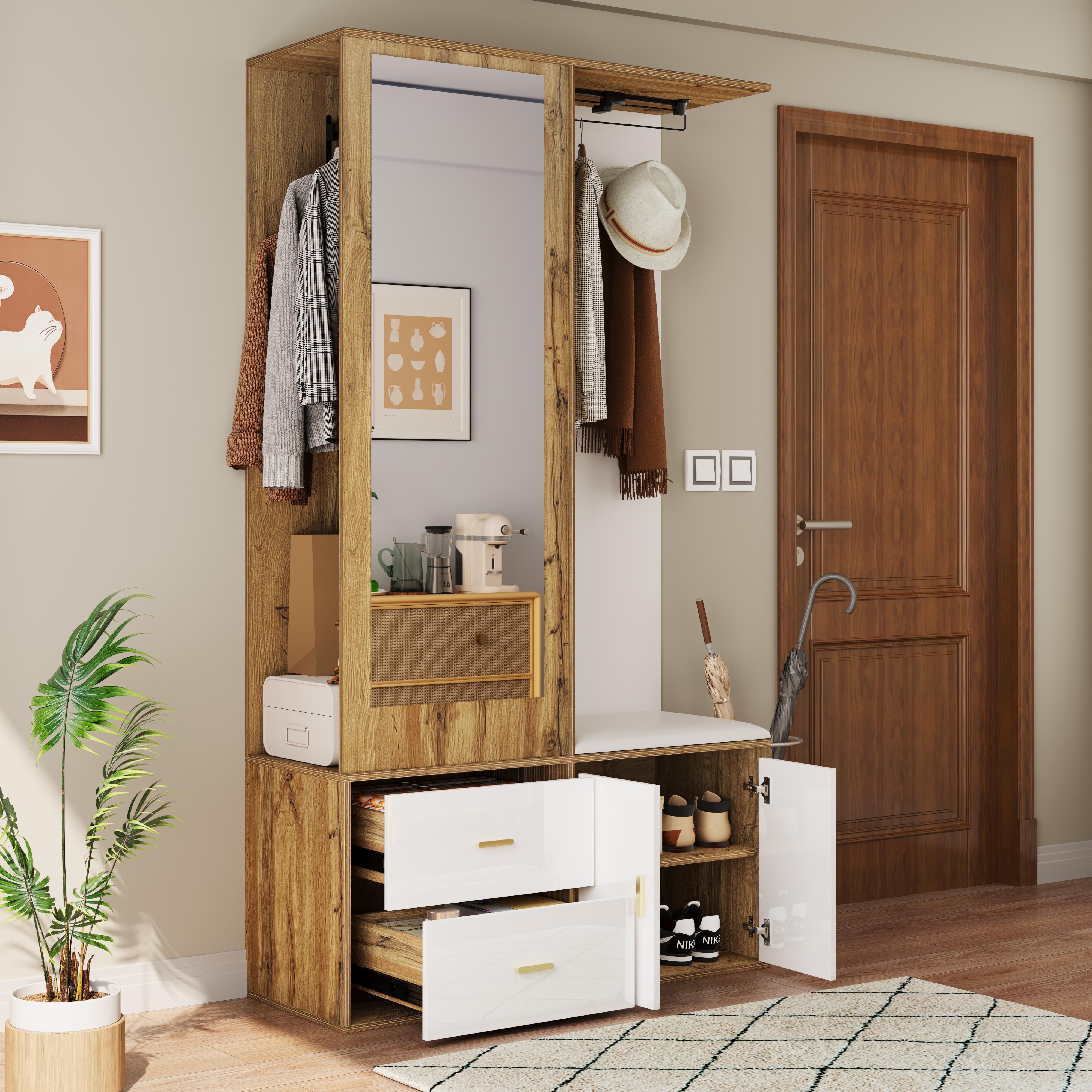 Elegante conjunto de perchero blanco y madera con espejo y zapatero.