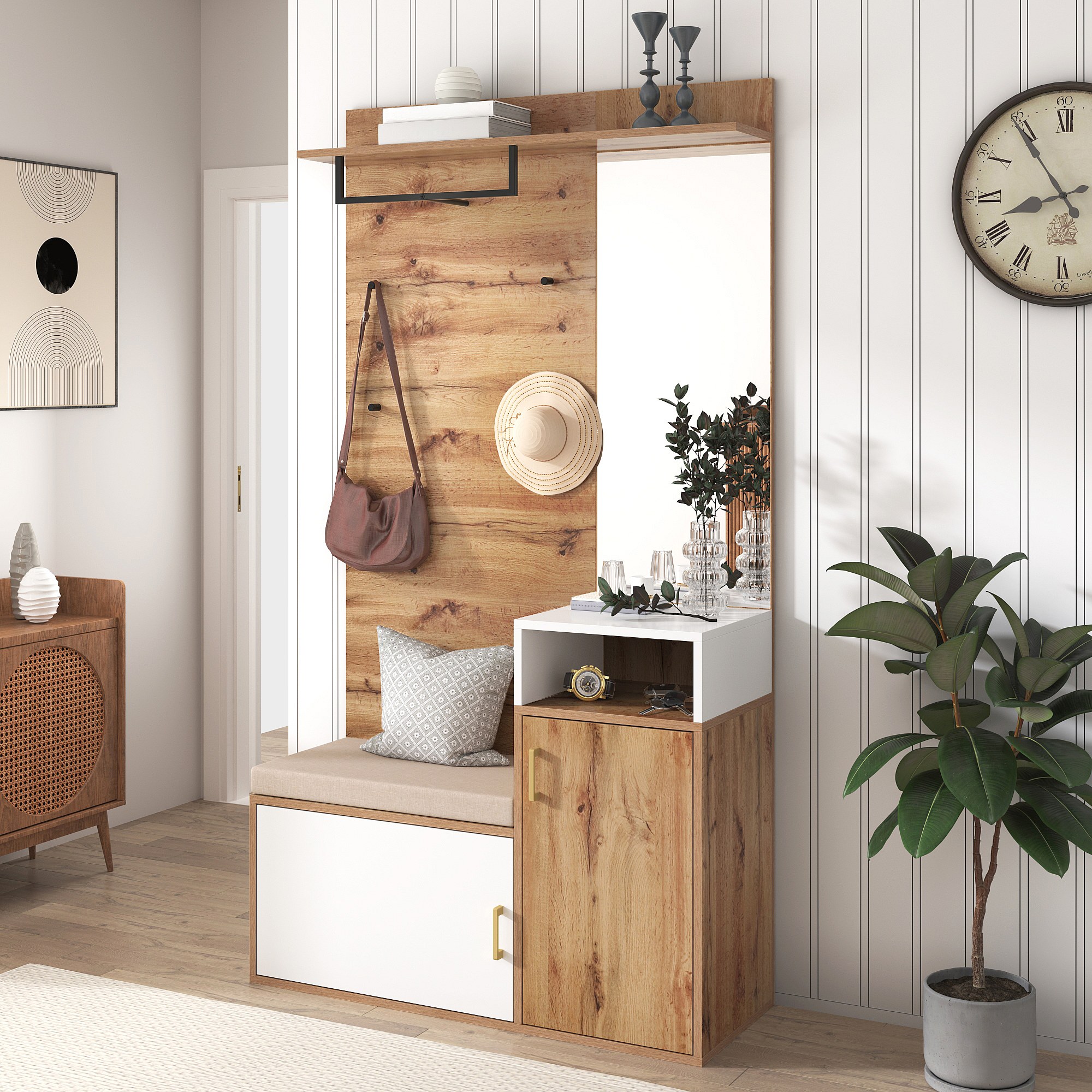 Elegante conjunto de perchero blanco y madera con espejo y zapatero