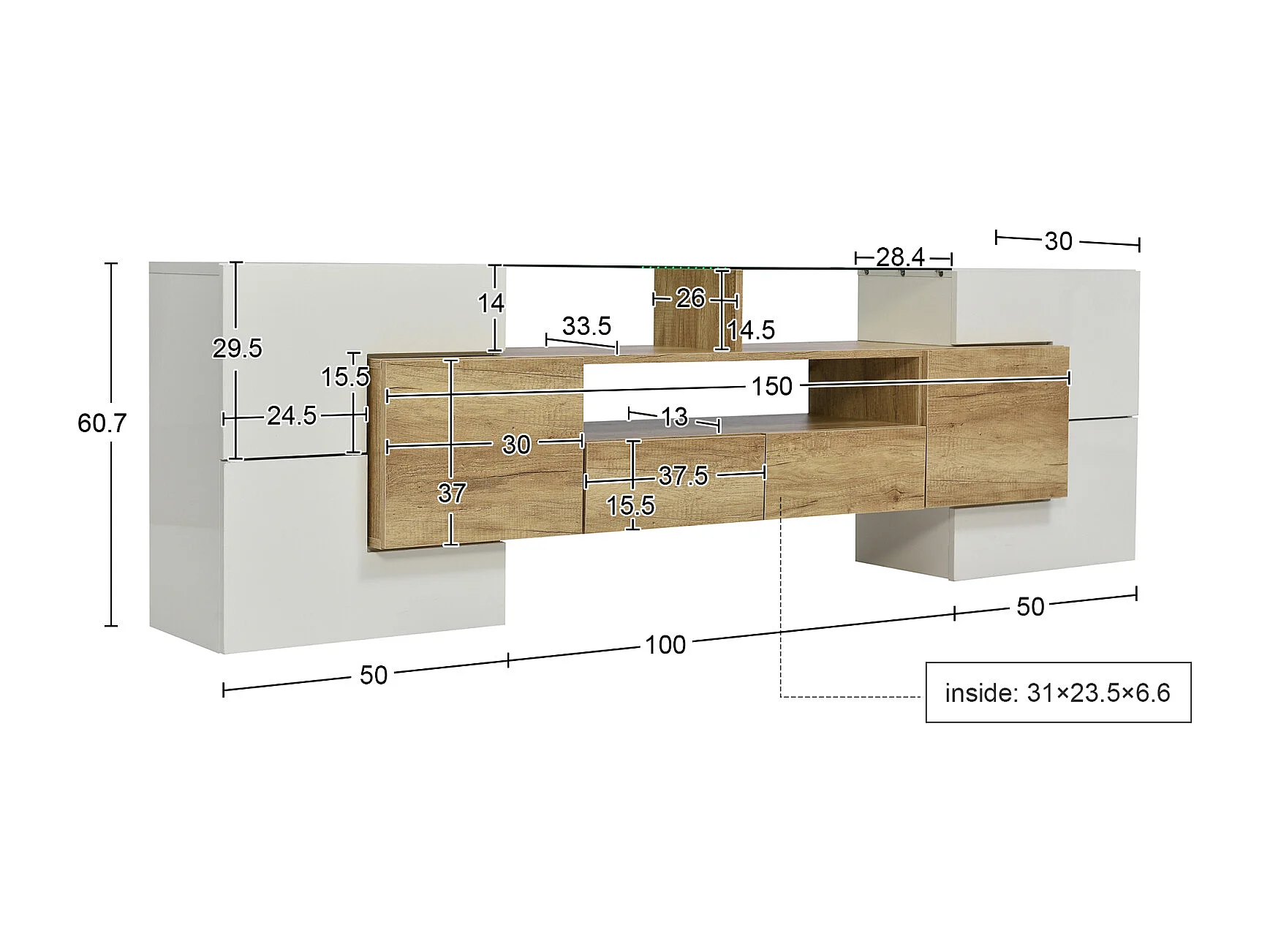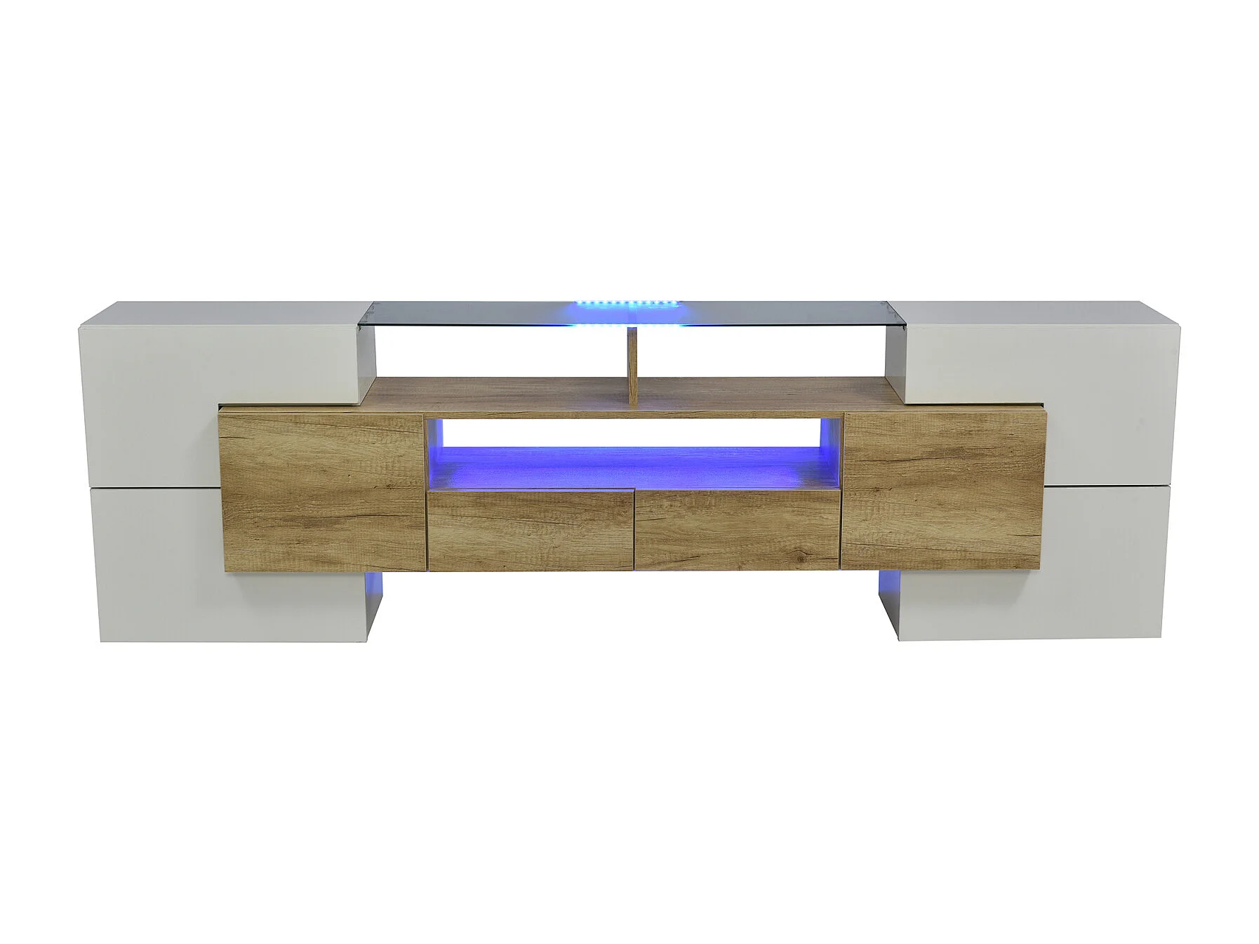 Mueble TV 190 cm, 3 puertas, 2 cajones, blanco con vetas doradas y madera