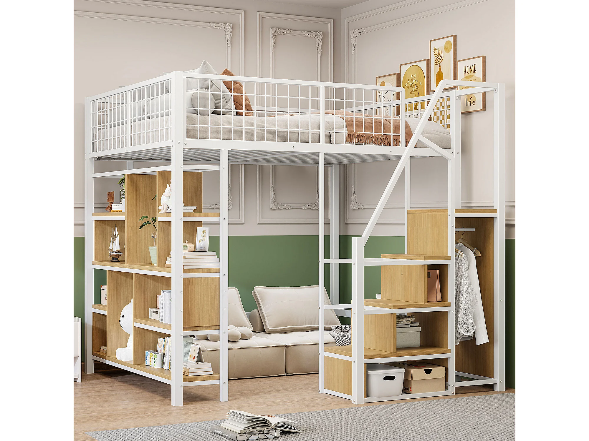 Cama alta versátil 140 x 200 cm, cama metálica con espacio de almacenamiento, estantes y escalera, color blanco
