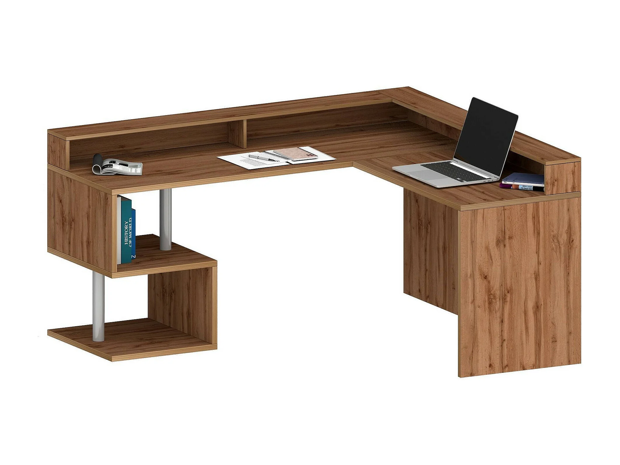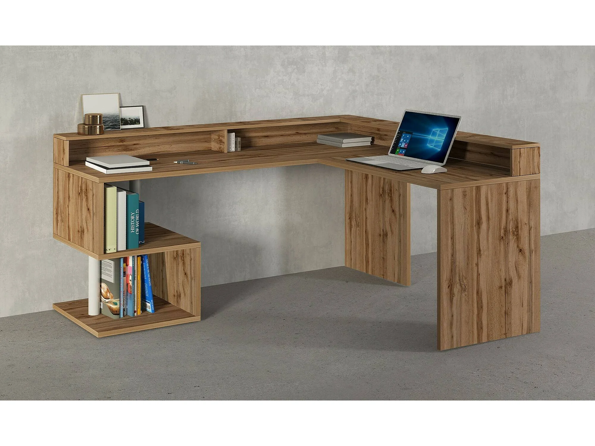 Escritorio Dcharpentie, Escritorio de esquina con estantes de almacenamiento, Escritorio de oficina multiusos con tablero, 180x92,5h160 cm, Roble