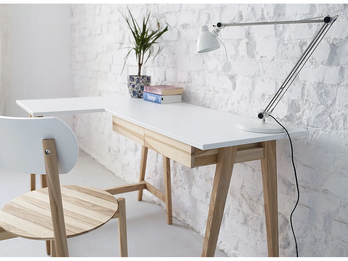 Escritorio esquinero con 2 cajones 135x85cm Luka Blanco | Patas de fresno | Lado izquierdo