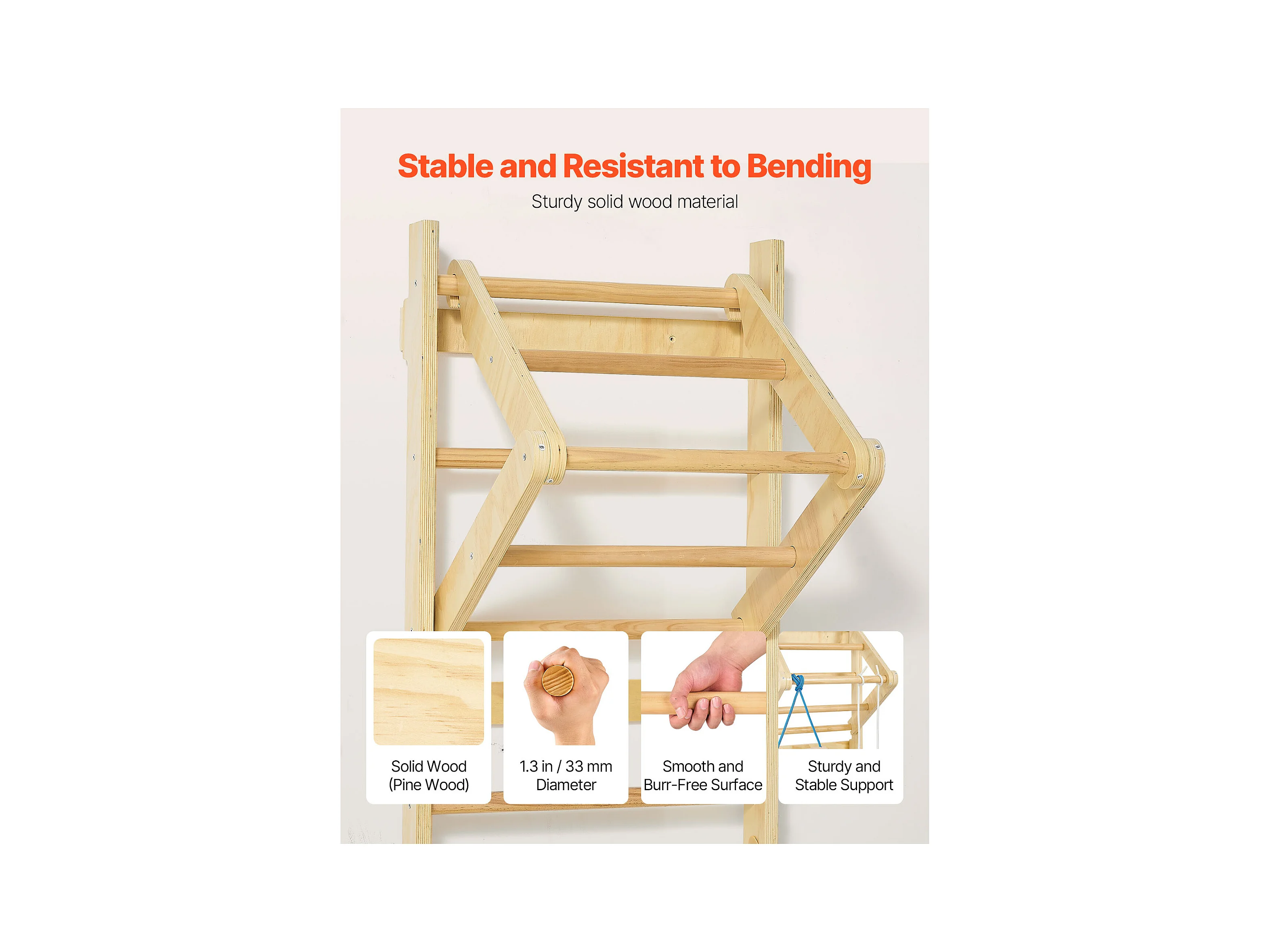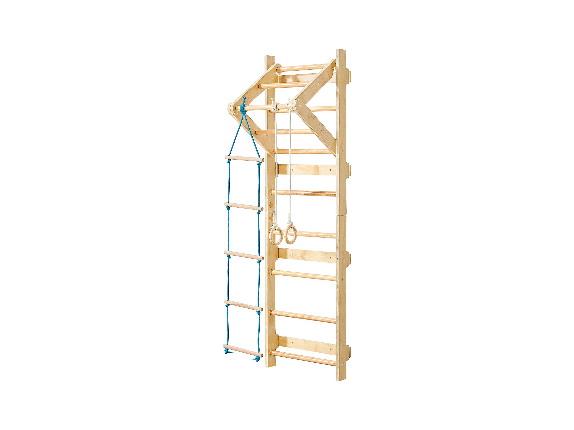 Espaldera de Madera Maciza SucceBuy, Escalera Sueca de Pared a 8 Niveles, Carga 100 kg, Gimnasio de Pared 4-en-1 con Anillos, Barra de Dominadas y Escalera