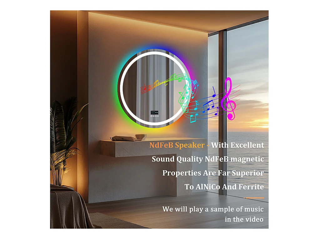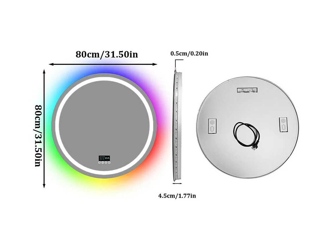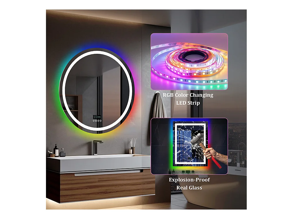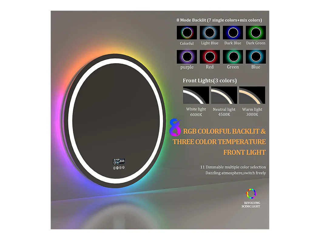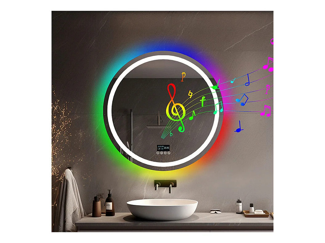 Espejo de baño 80x80cm RGB y LED regulable + antivaho + Bluetooth 5.2 + Reloj + 3 colores 4 botones