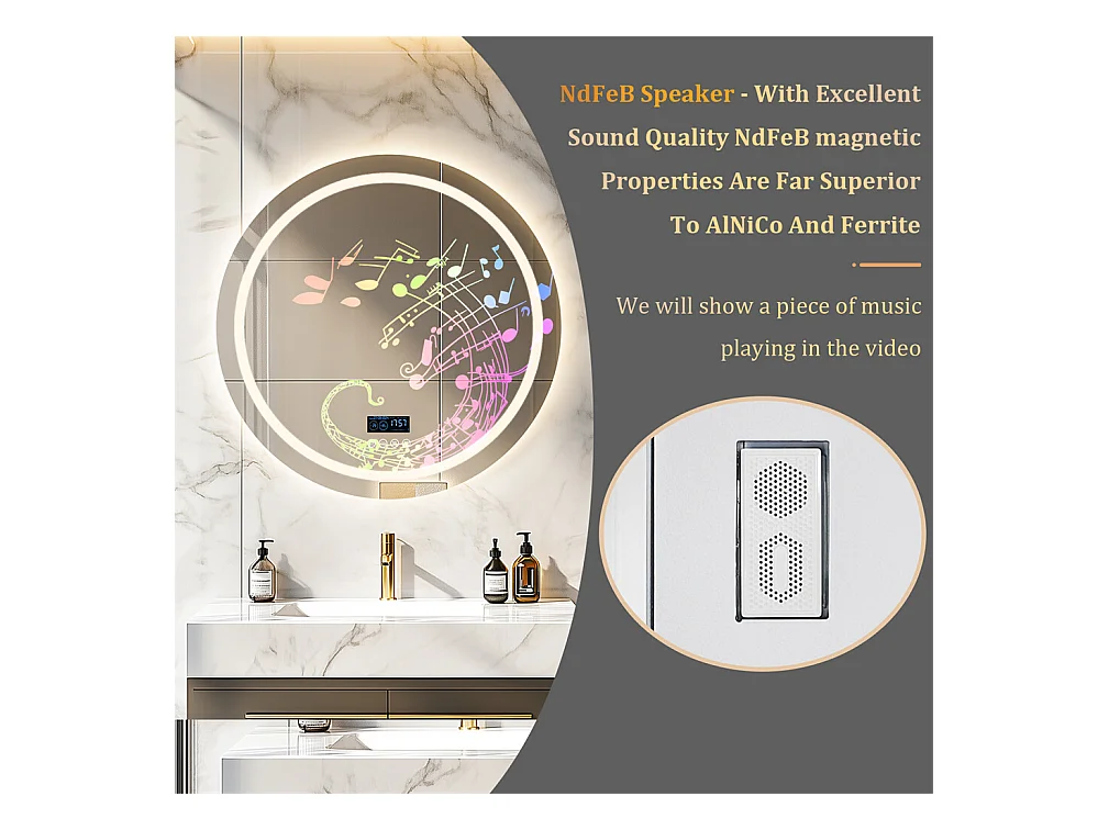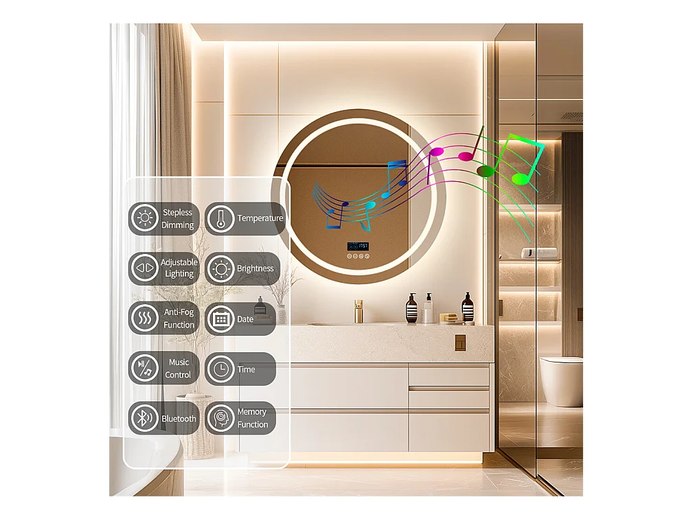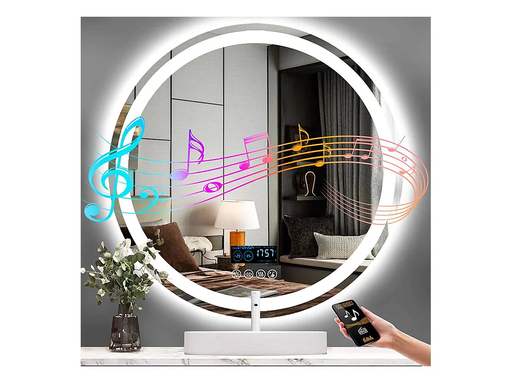 Espejo de baño 80x80cm RGB y LED regulable + antivaho + Bluetooth 5.2 + Reloj + 3 colores 4 botones