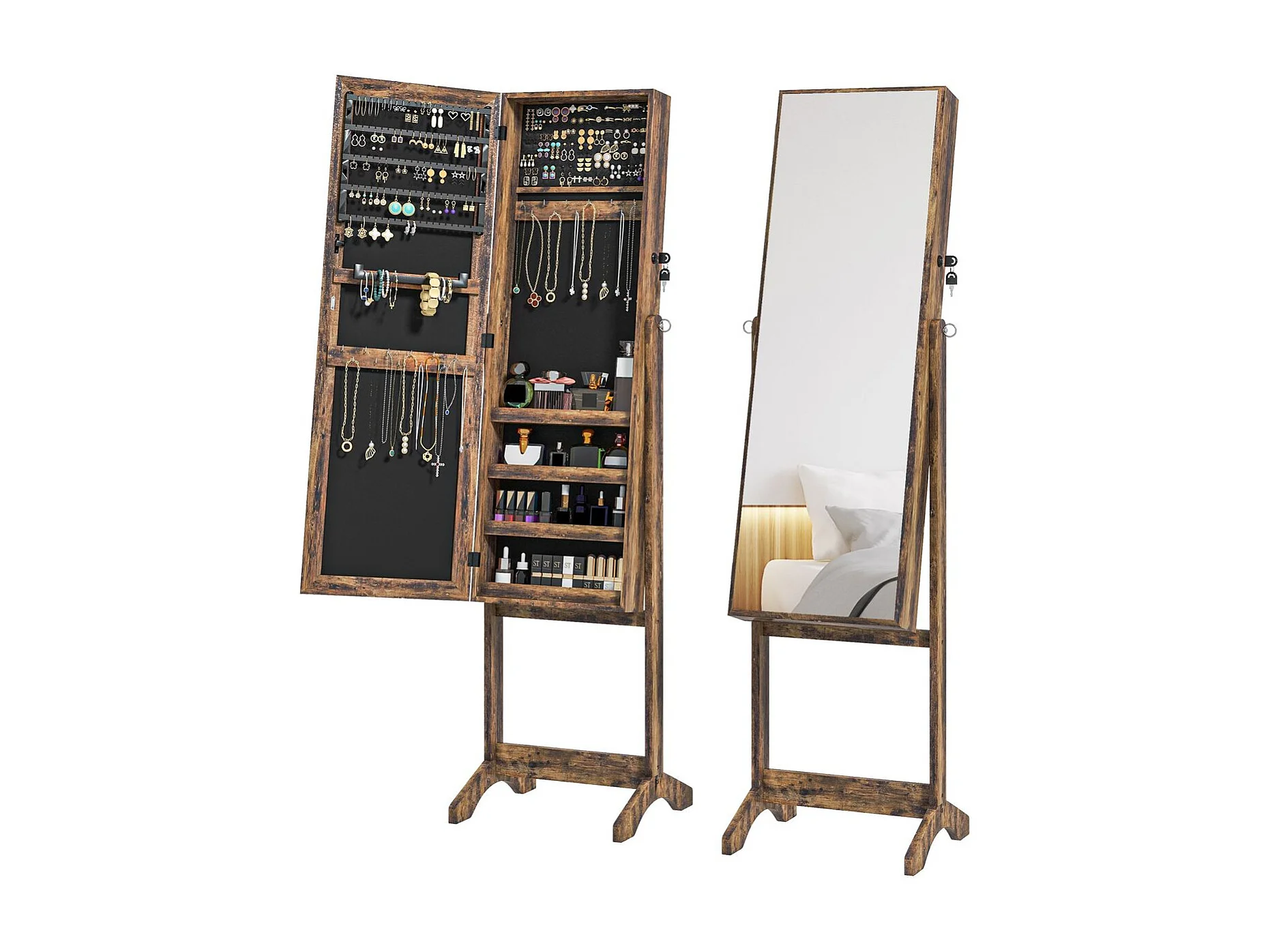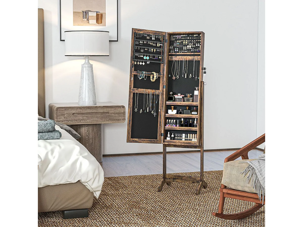 Armario de Joyas SucceBuy de Pie de Madera, Cofre de Almacenamiento de Joyas con 4 Cajones, Espejo Plegable, 4 Compartimentos de Almacenamiento Superiores, Asas