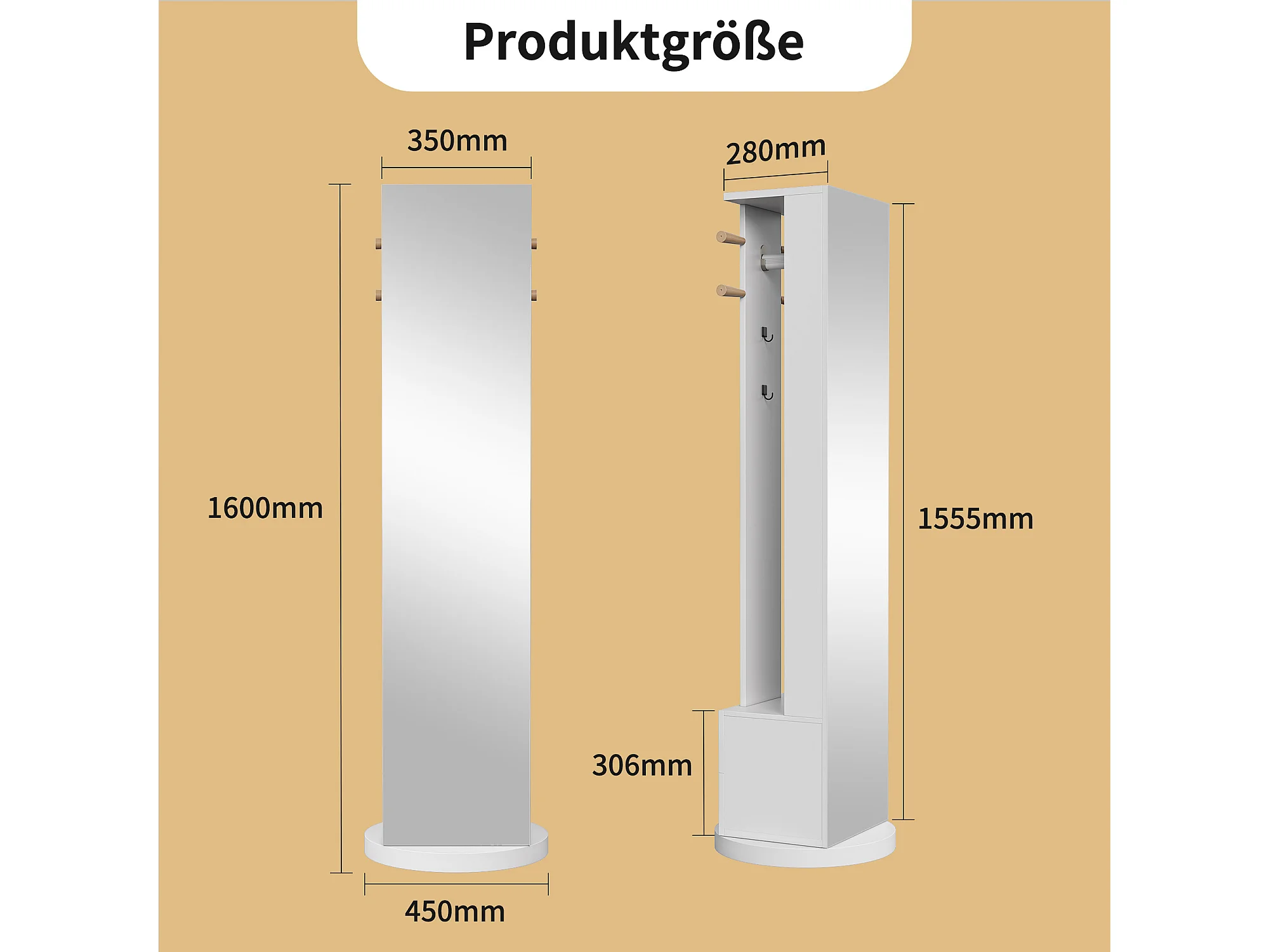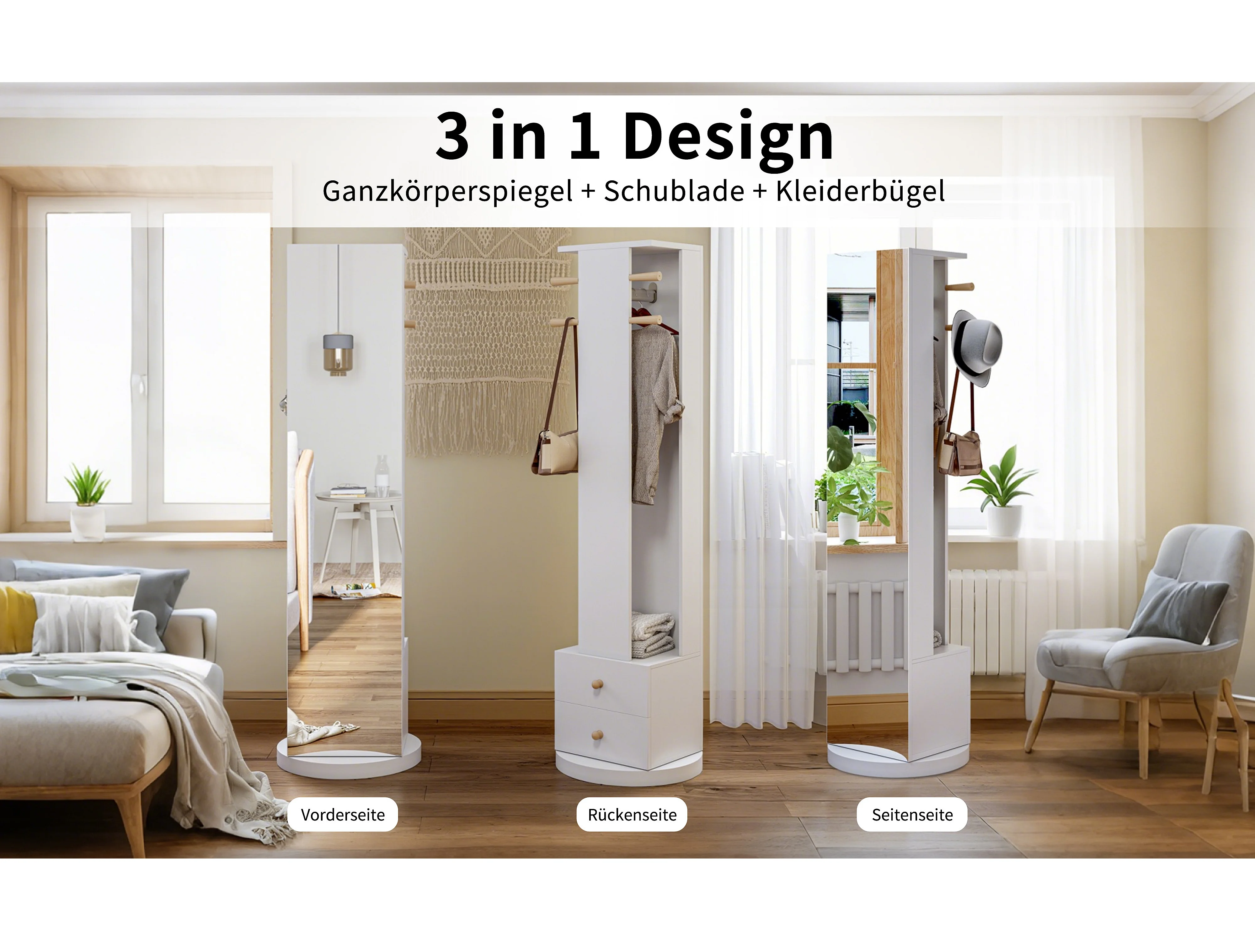 Espejo de pie 3 en 1, giratorio 360°, de madera maciza, con armario y 2 cajones, 160 x 45 cm