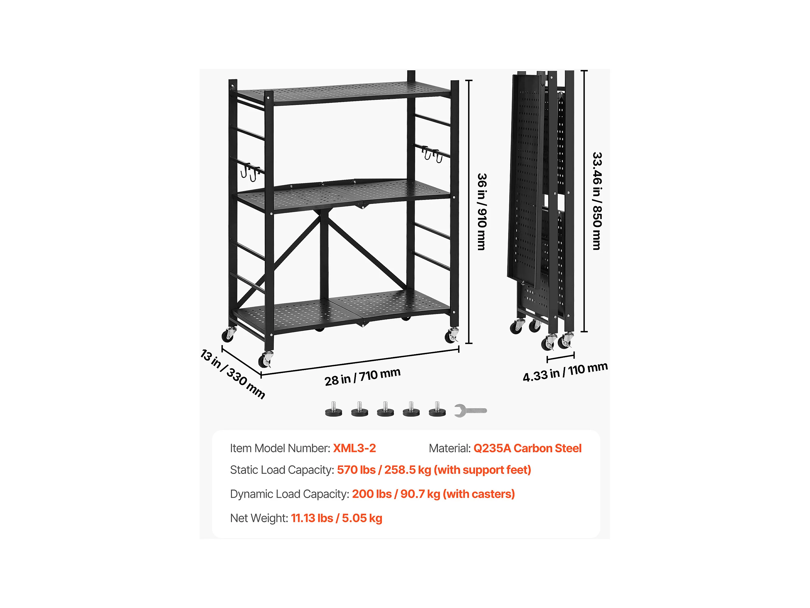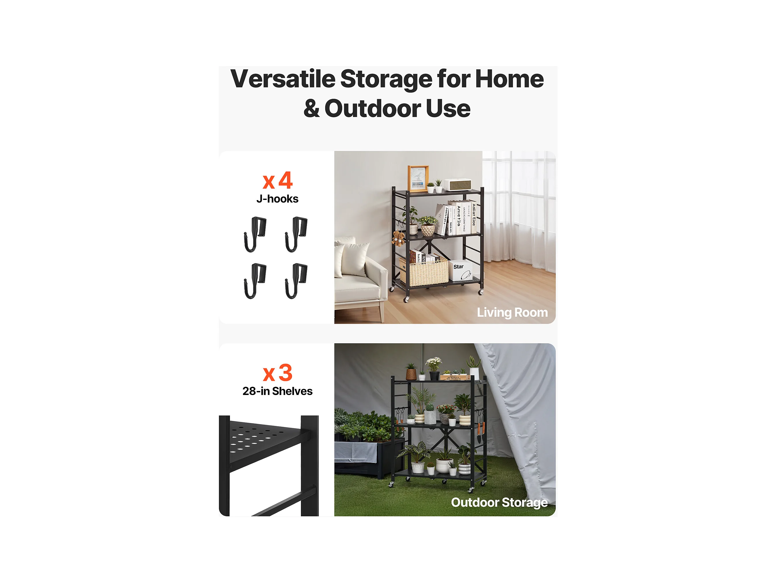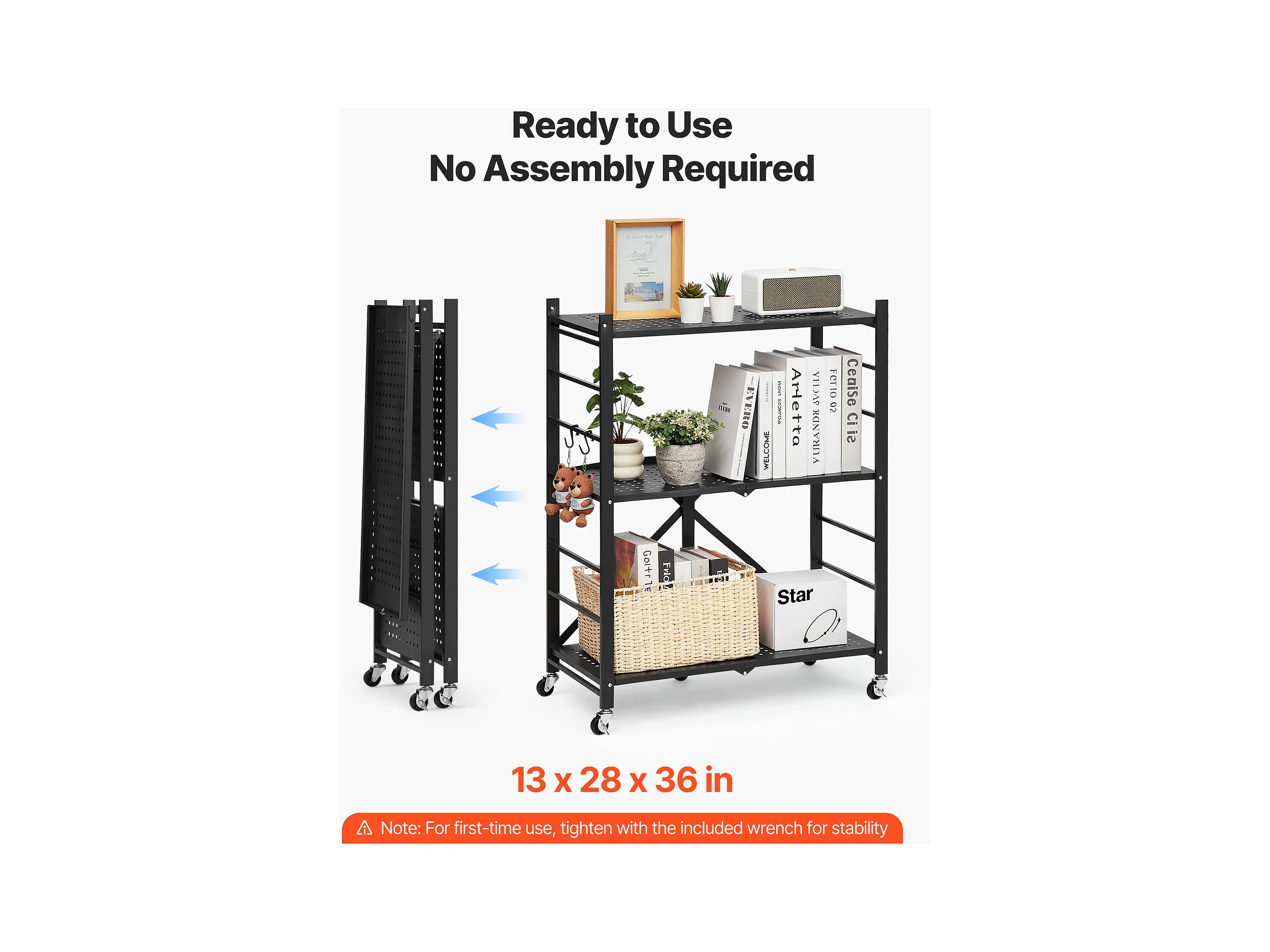 Estante Plegable SucceBuy Estantería Plegable de 3 Niveles, 71 x 33 x 91 cm, Metal Resistente, con Ruedas y Ganchos, para Despensa, Cocina. Color Negro