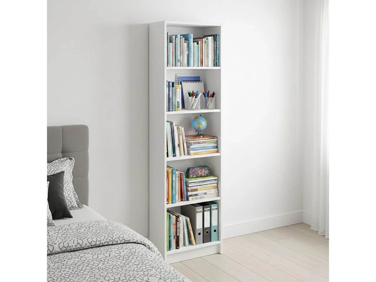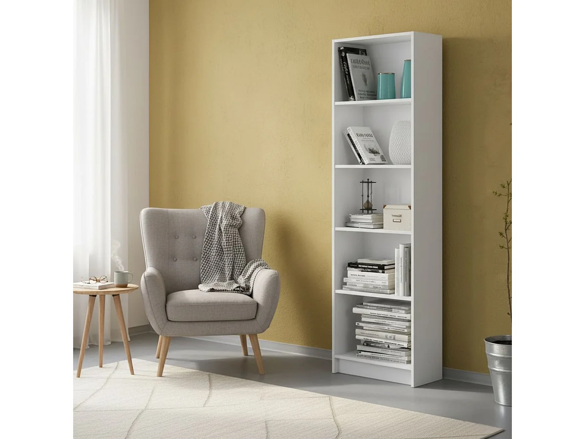 Librería Pomona, Librería alta con 5 estantes, Estantería para oficina o dormitorio, Estantería moderna con compartimentos, 52x25h80 cm, Blanco