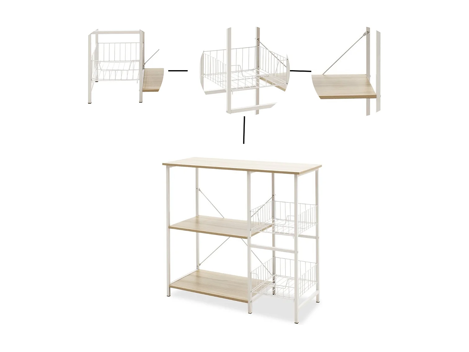 Estanteria de Cocina, Estantería para Microondas con 2 Cestas de Malla Metálica Blanca, 3 Estantes y Ganchos 80x34x75cm Color Madera y Blanco