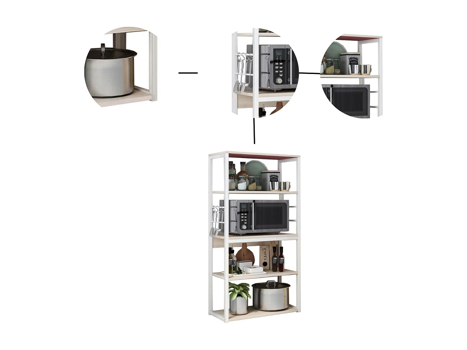 Estantería de Cocina, Estantería para Microondas, Estante Abierto de Pie 2 Mallas metálicas y múltiples Estantes 80x30x142cm, Color Blanco y Madera