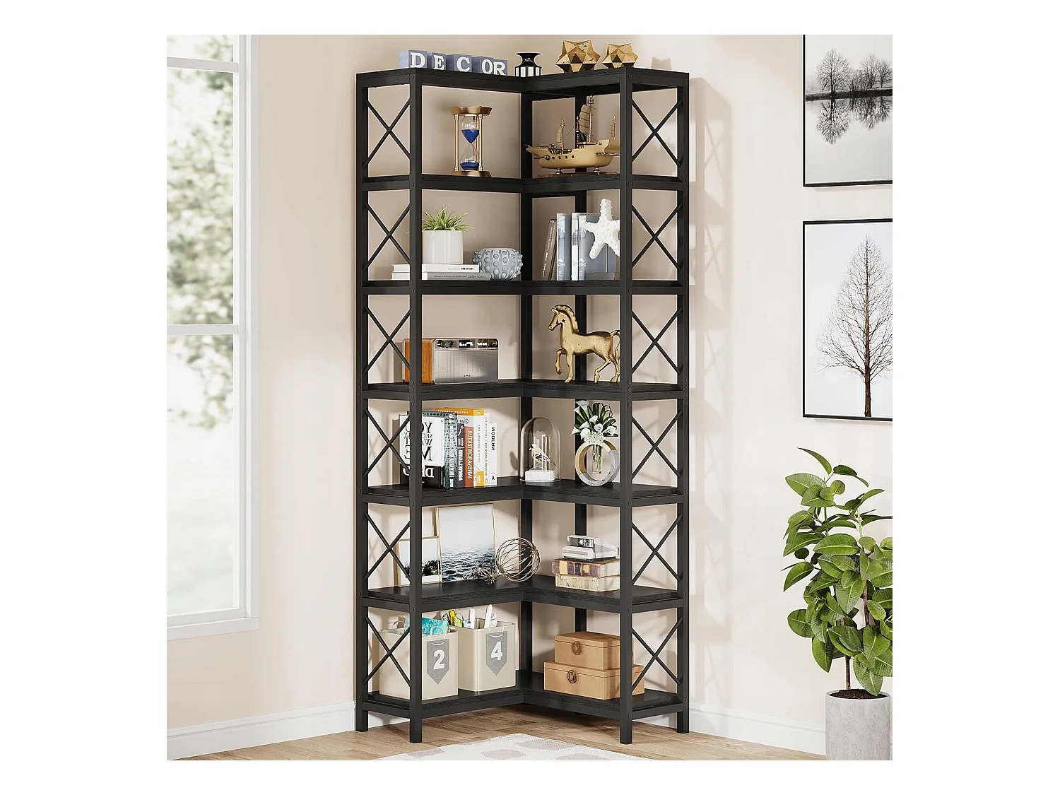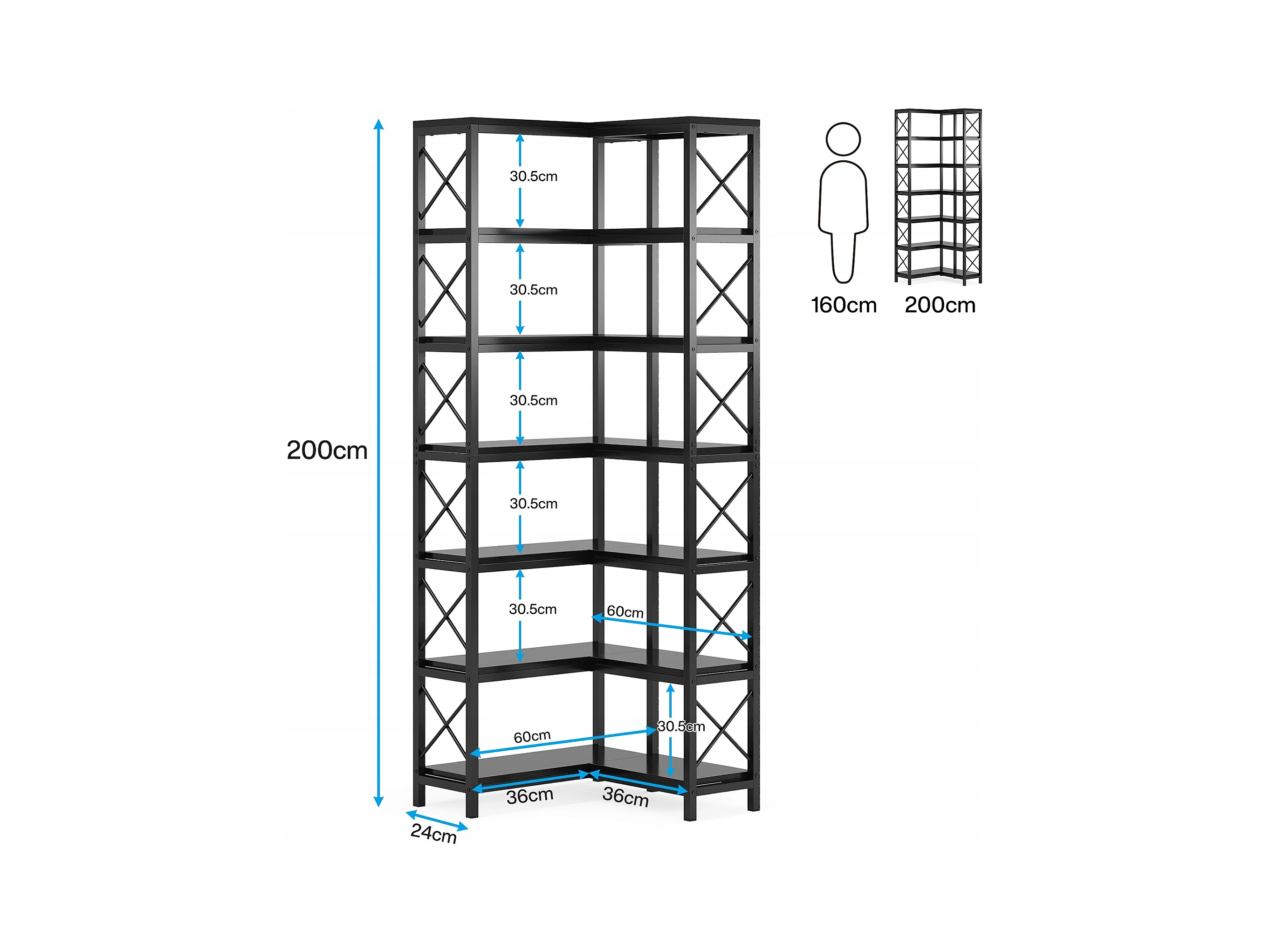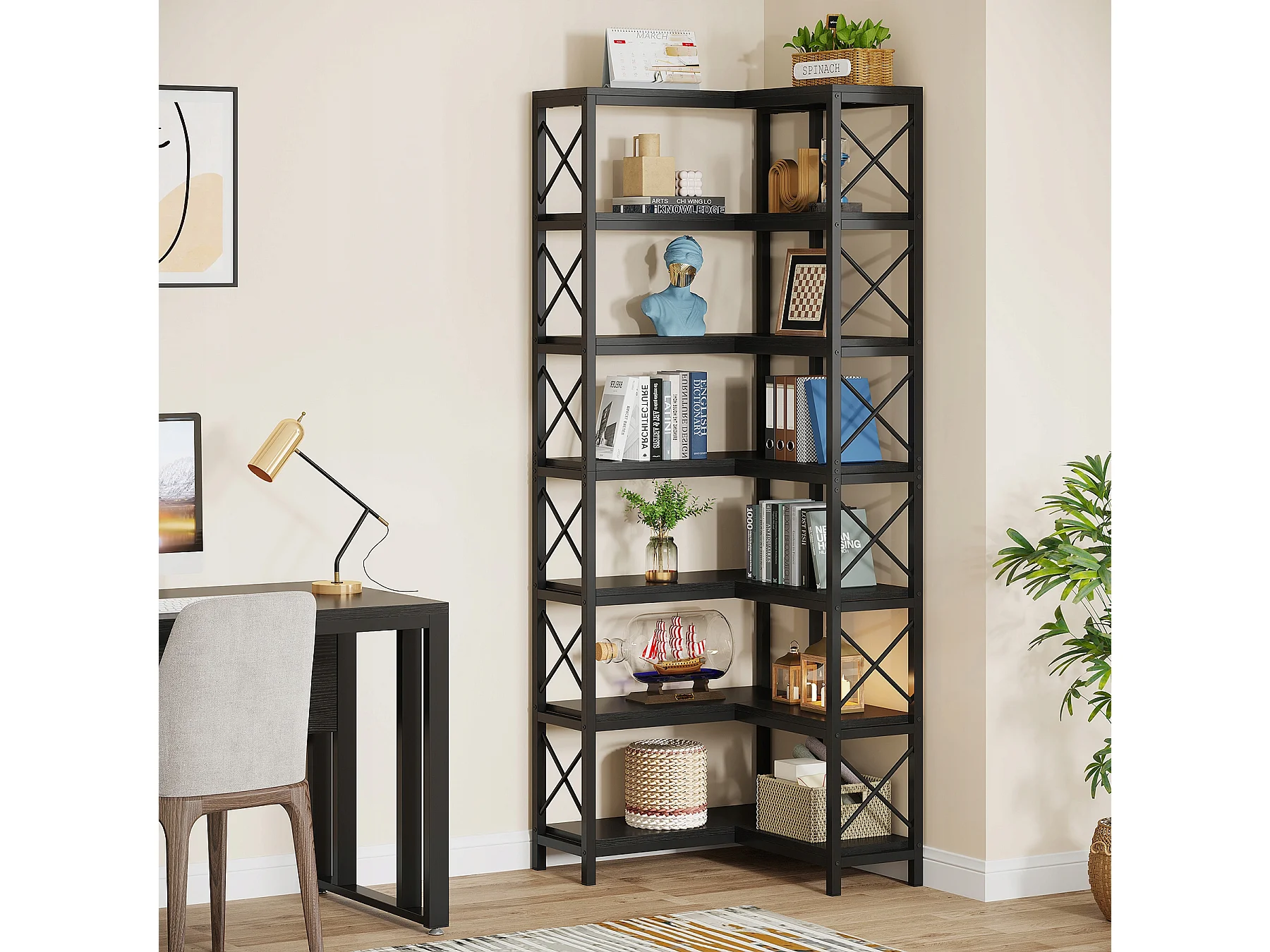 Esquina de biblioteca, gran estantería de esquina industrial, estantería de esquina sobre patas con marco de metal (7 estantes - negro)